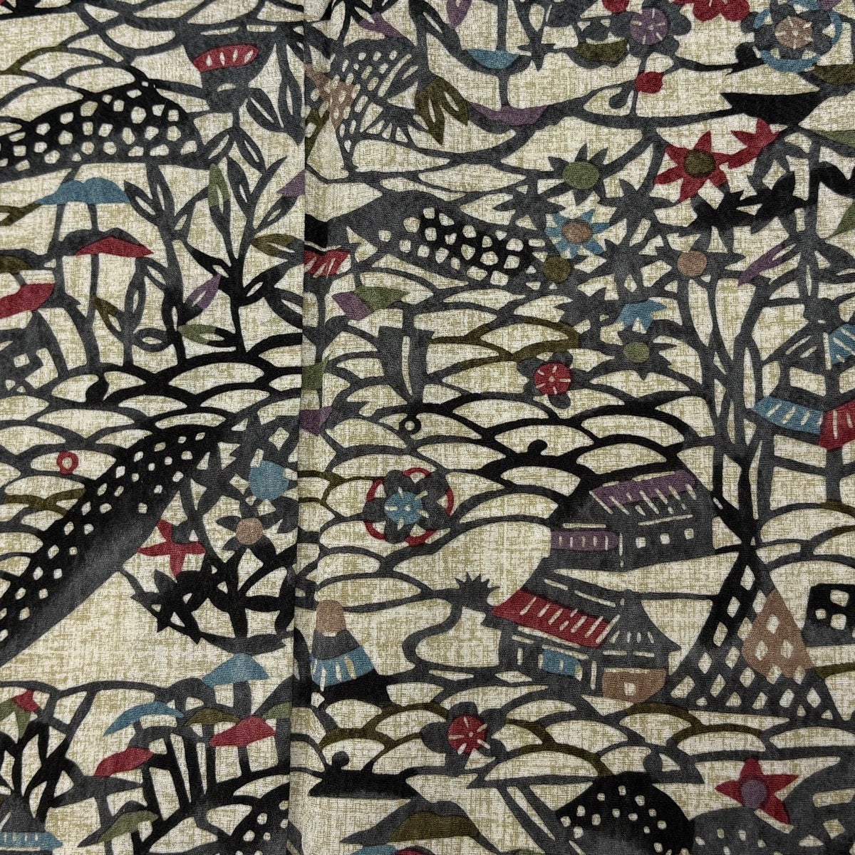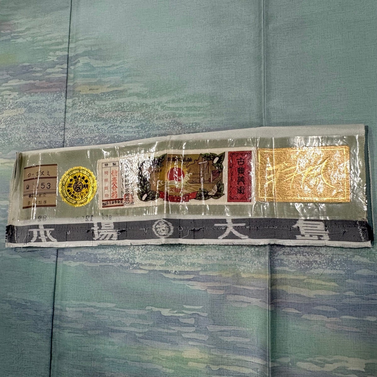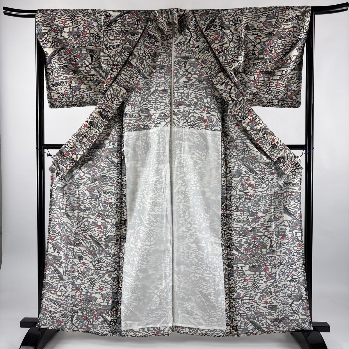 【美品】 小紋 身丈163.5cm 裄丈65.5cm M 単衣 落款あり 家屋 草花 灰緑 正絹 秀品
