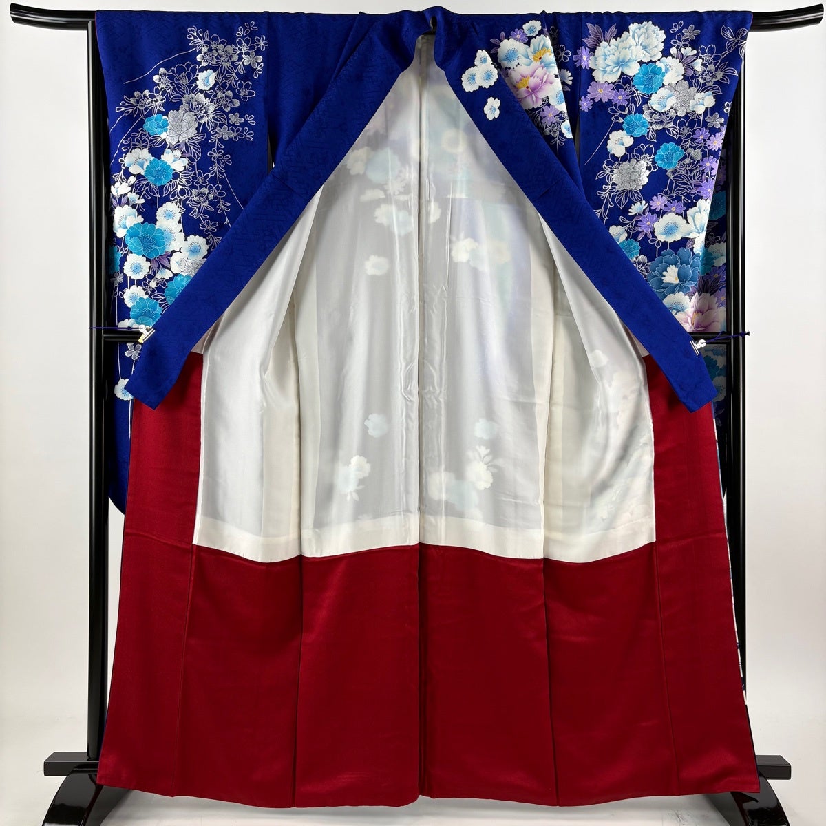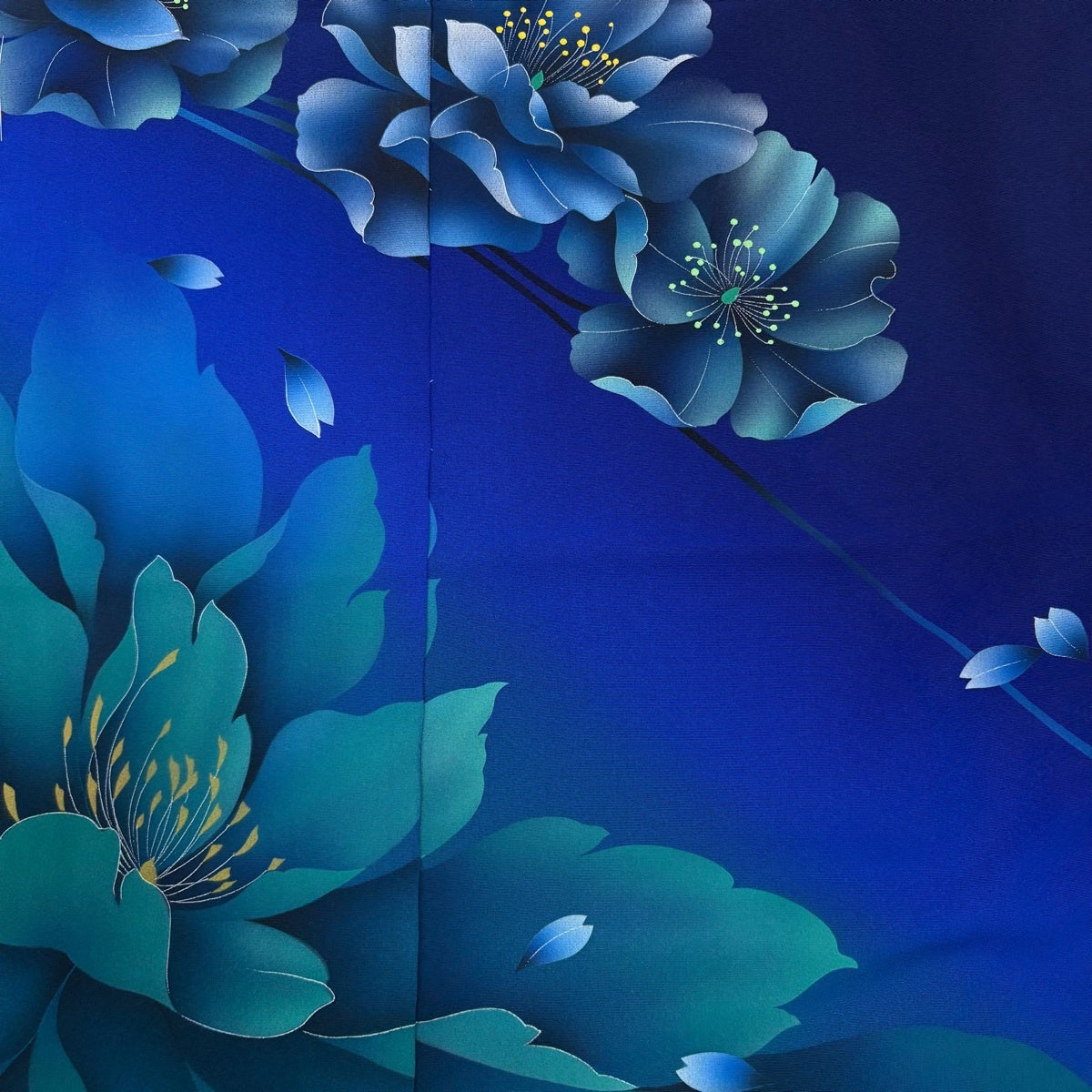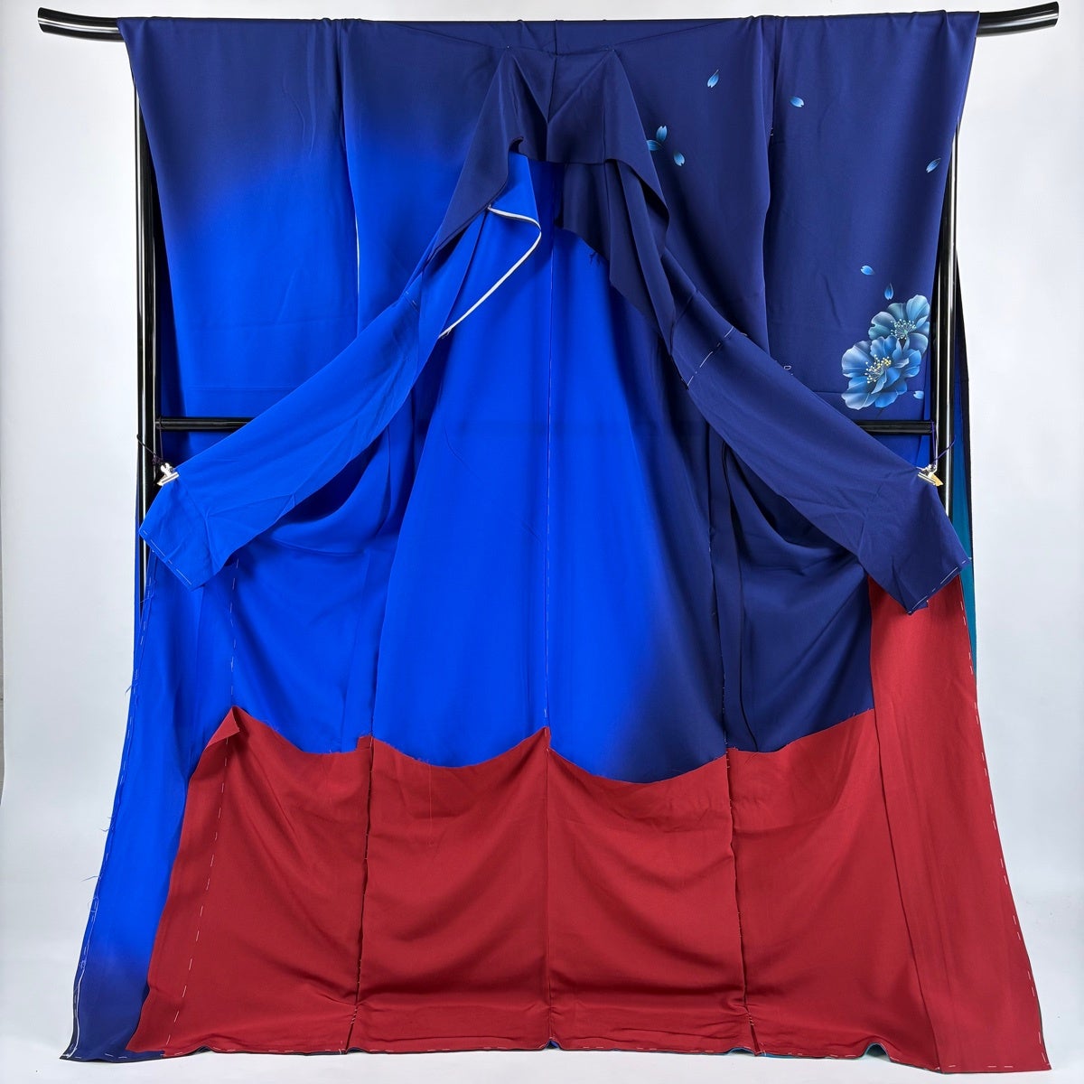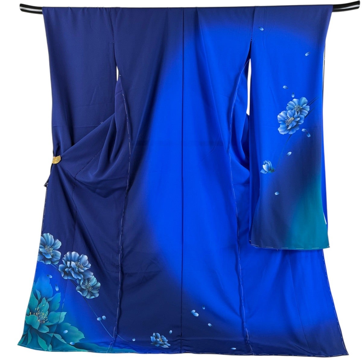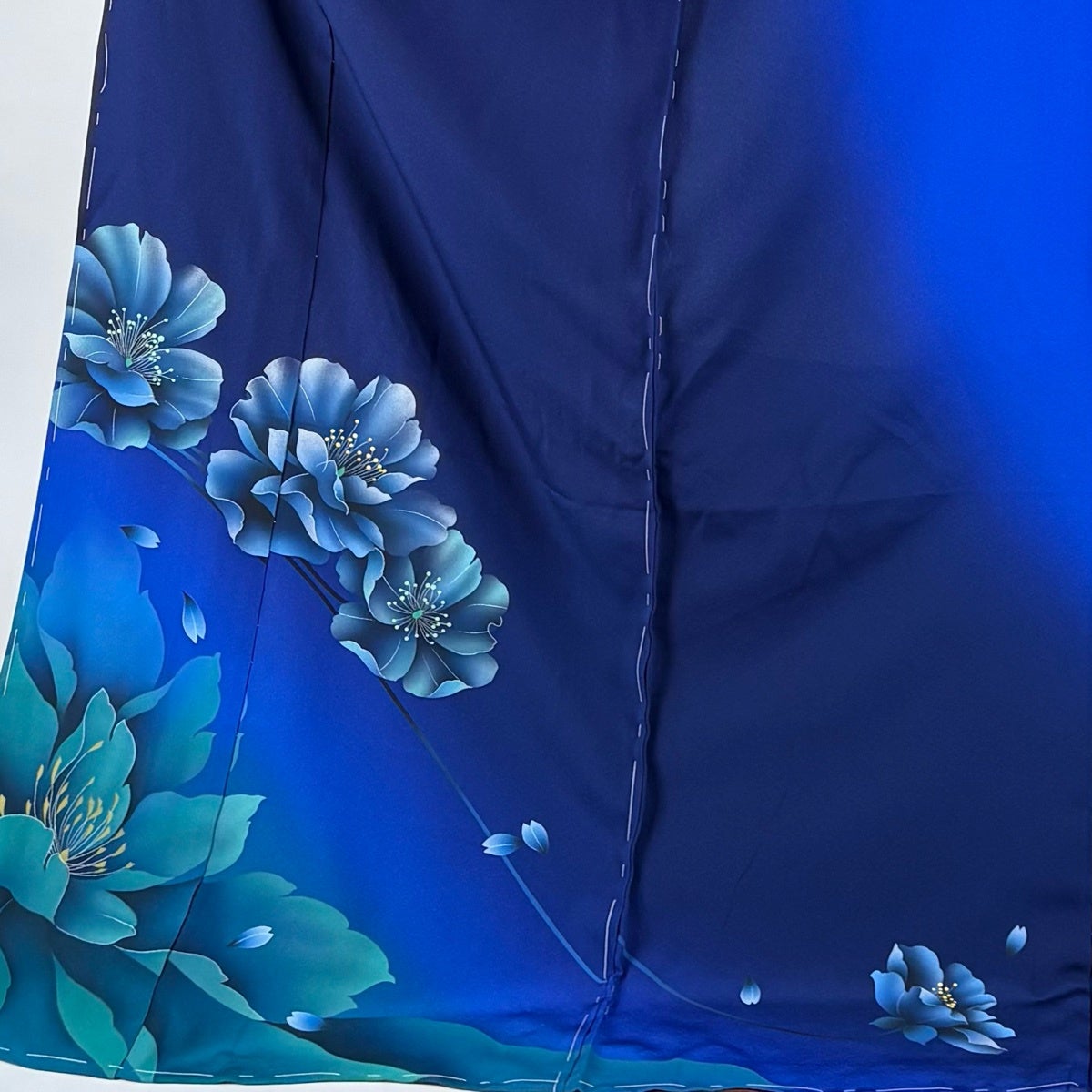 【美品】 振袖 身丈185.5cm 裄丈73cm 未仕立て 仮絵羽 牡丹 花弁 ぼかし 紺色 正絹 秀品