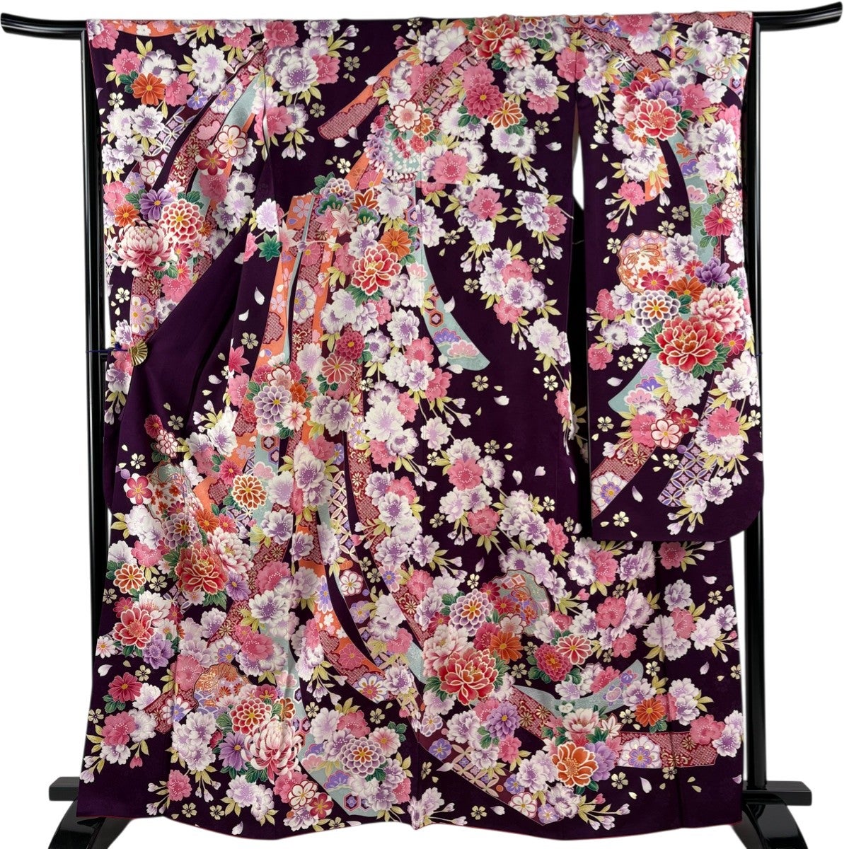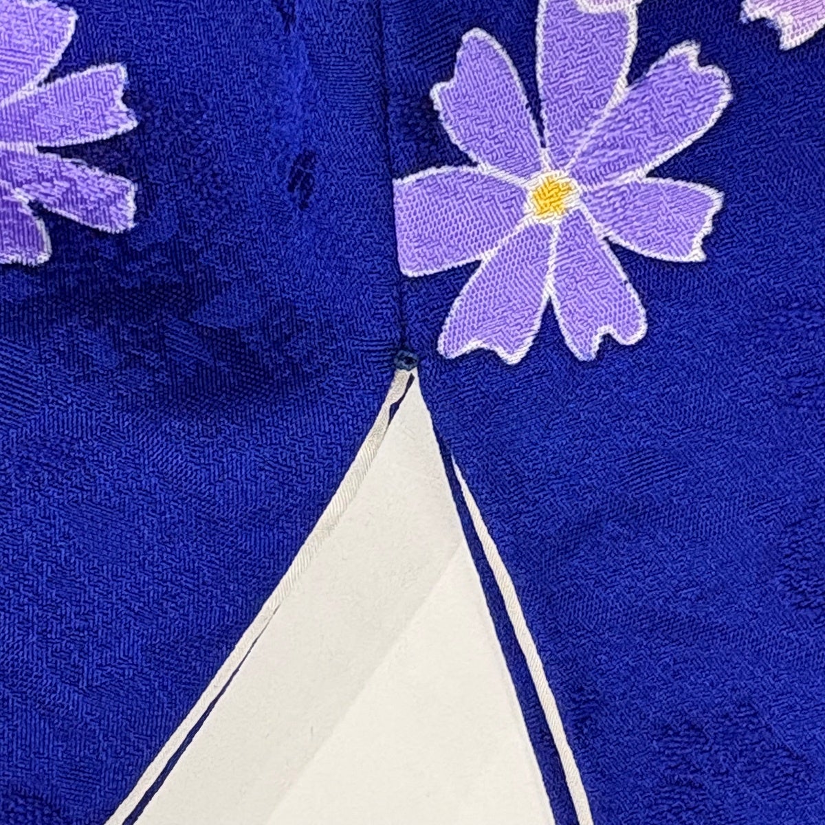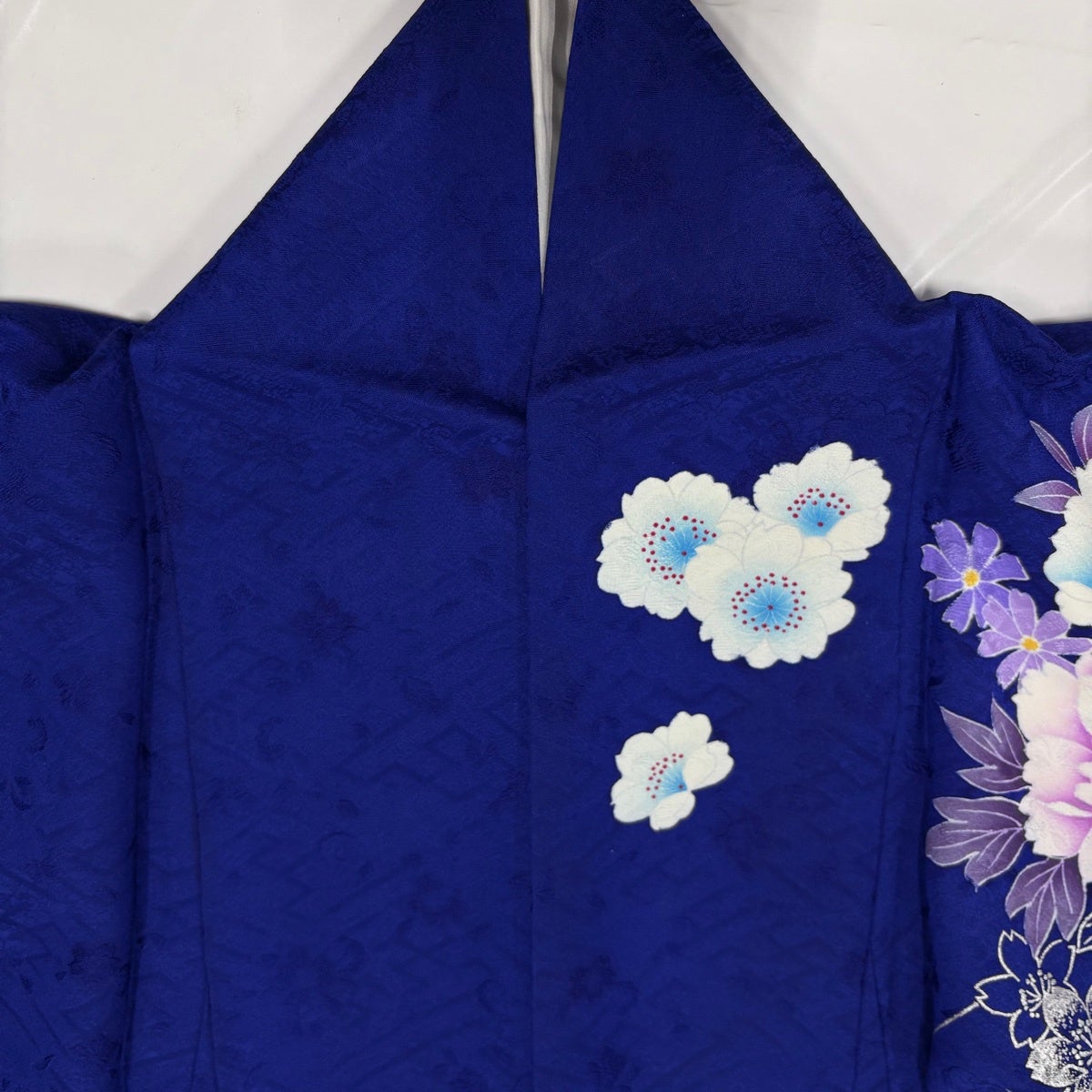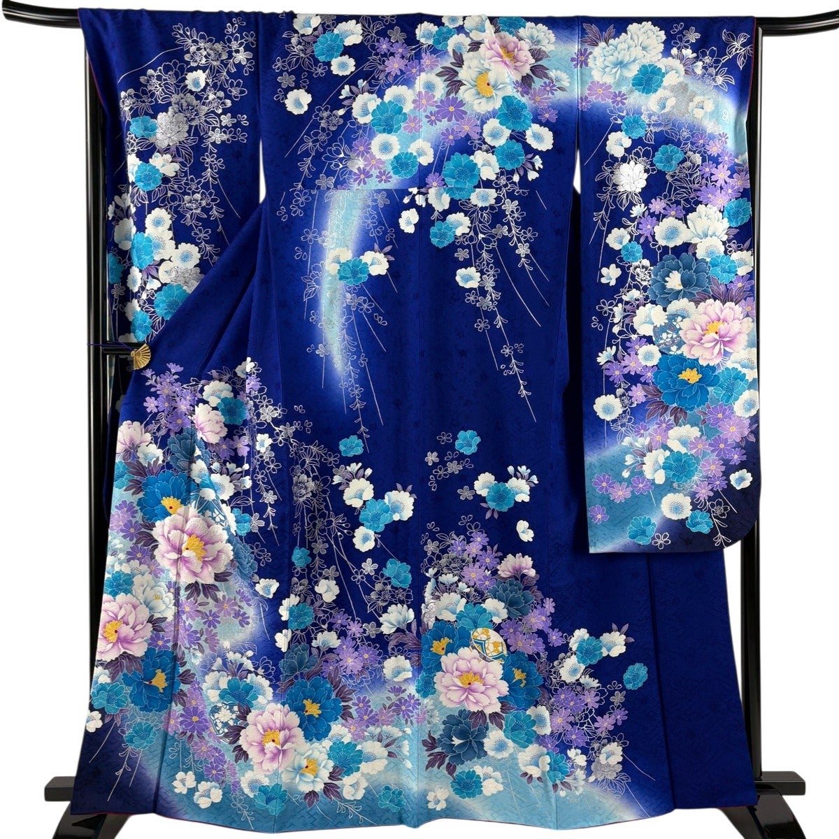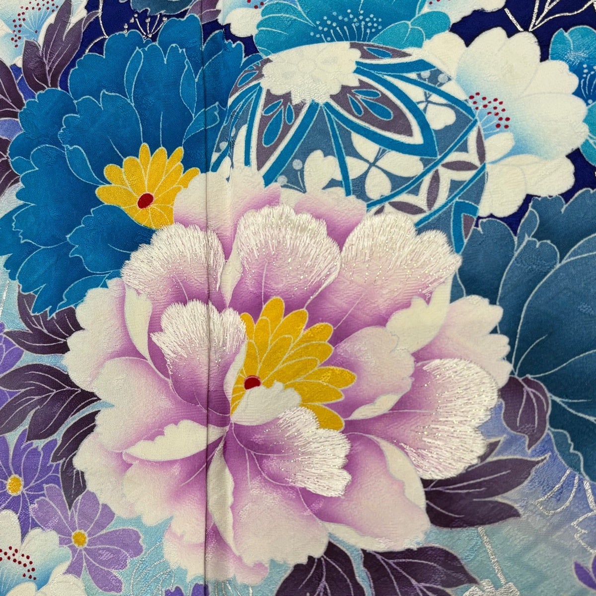 【美品】 振袖 身丈185.5cm 裄丈73cm 未仕立て 仮絵羽 牡丹 花弁 ぼかし 紺色 正絹 秀品