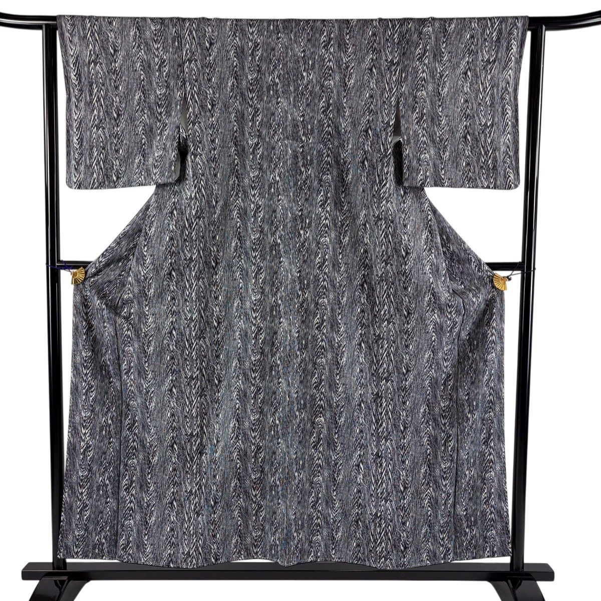 紬 身丈164cm 裄丈68.5cm L 単衣 幾何学模様 濃紺 正絹 秀品