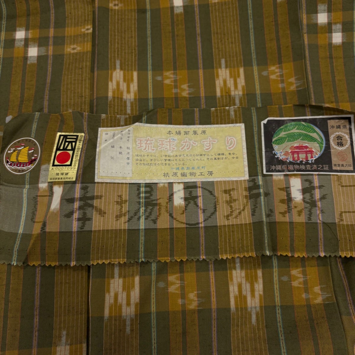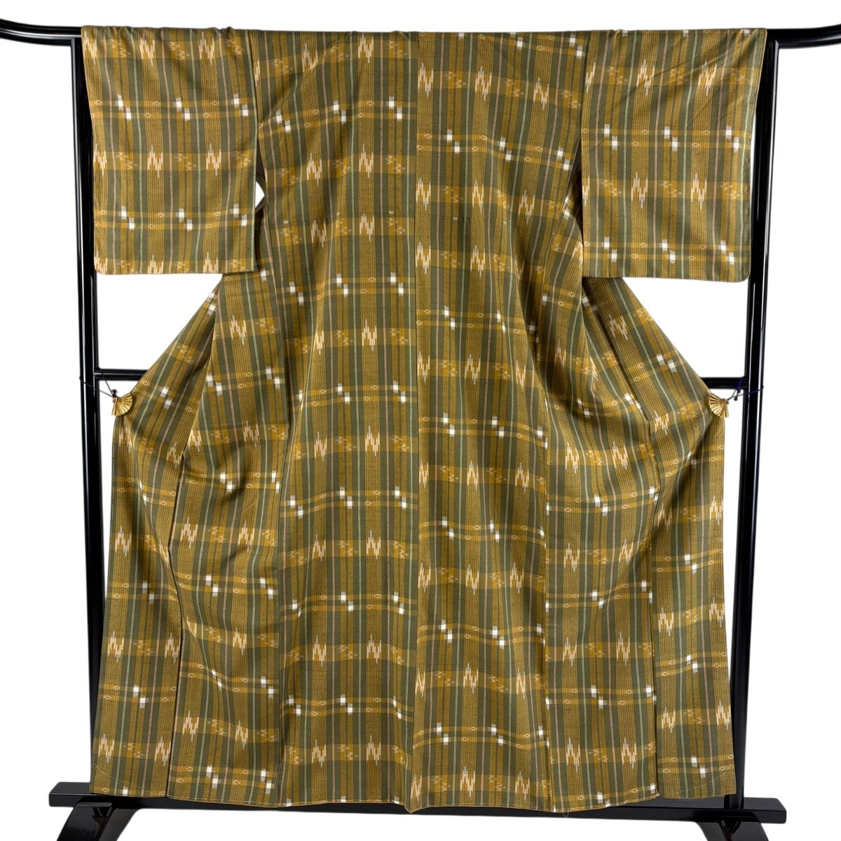 【美品】 紬 身丈158.5cm 裄丈65cm M 袷 琉球絣 証紙あり 燕 縦縞 山吹茶色 正絹 逸品