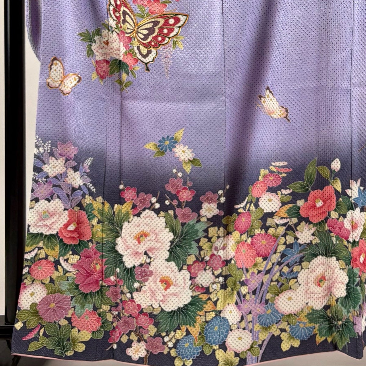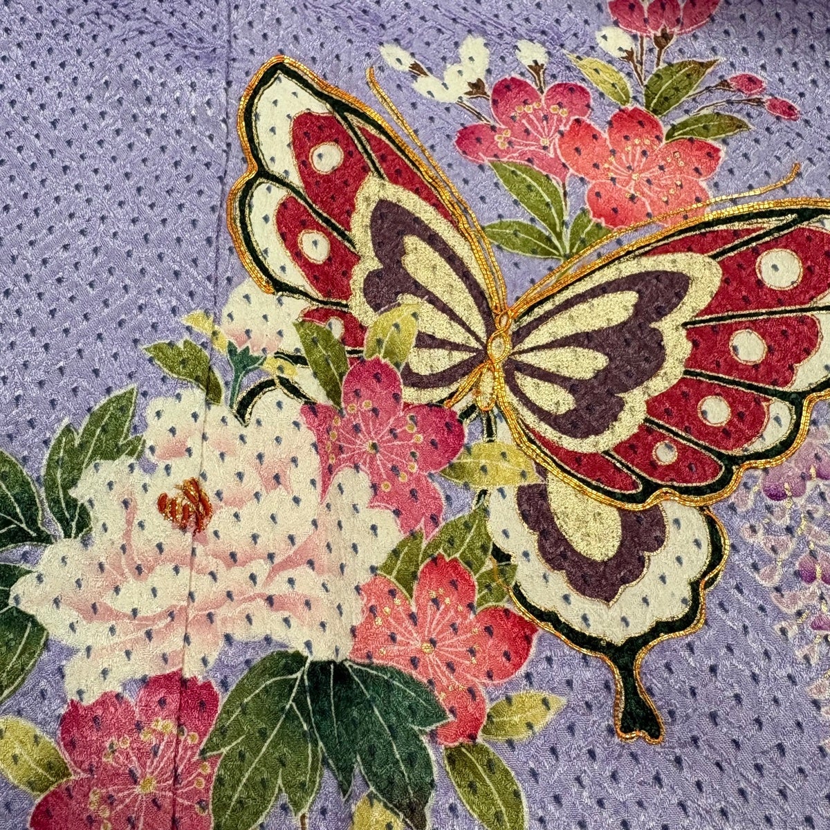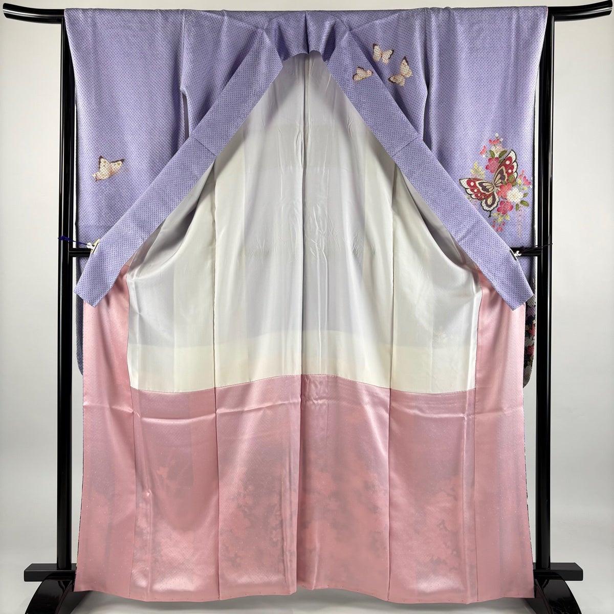 振袖 身丈164.5cm 裄丈65.5cm M 袷 蝶 草花 金糸 総絞り 薄紫 正絹 名品