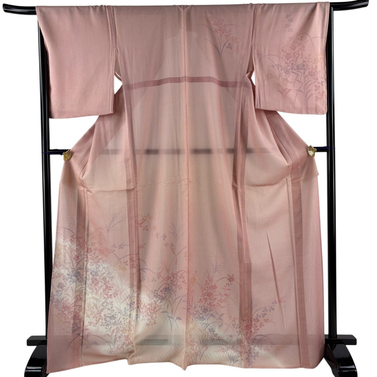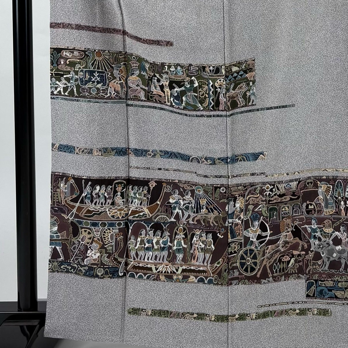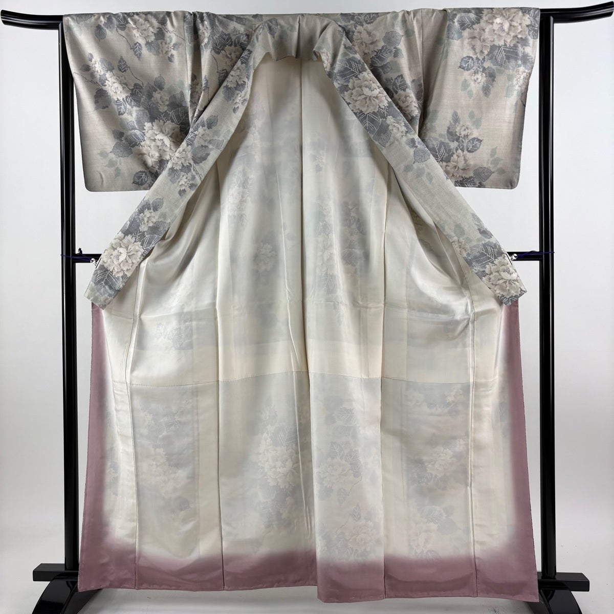 訪問着 身丈164cm 裄丈66.5cm M 単衣 紬地 樹木 ぼかし 灰白 正絹 秀品