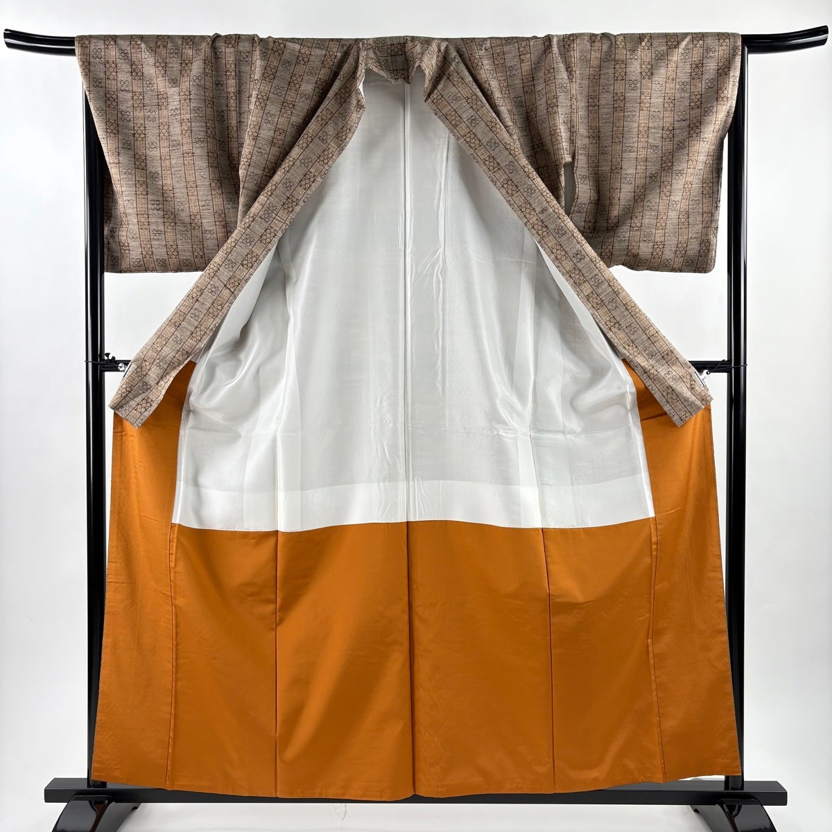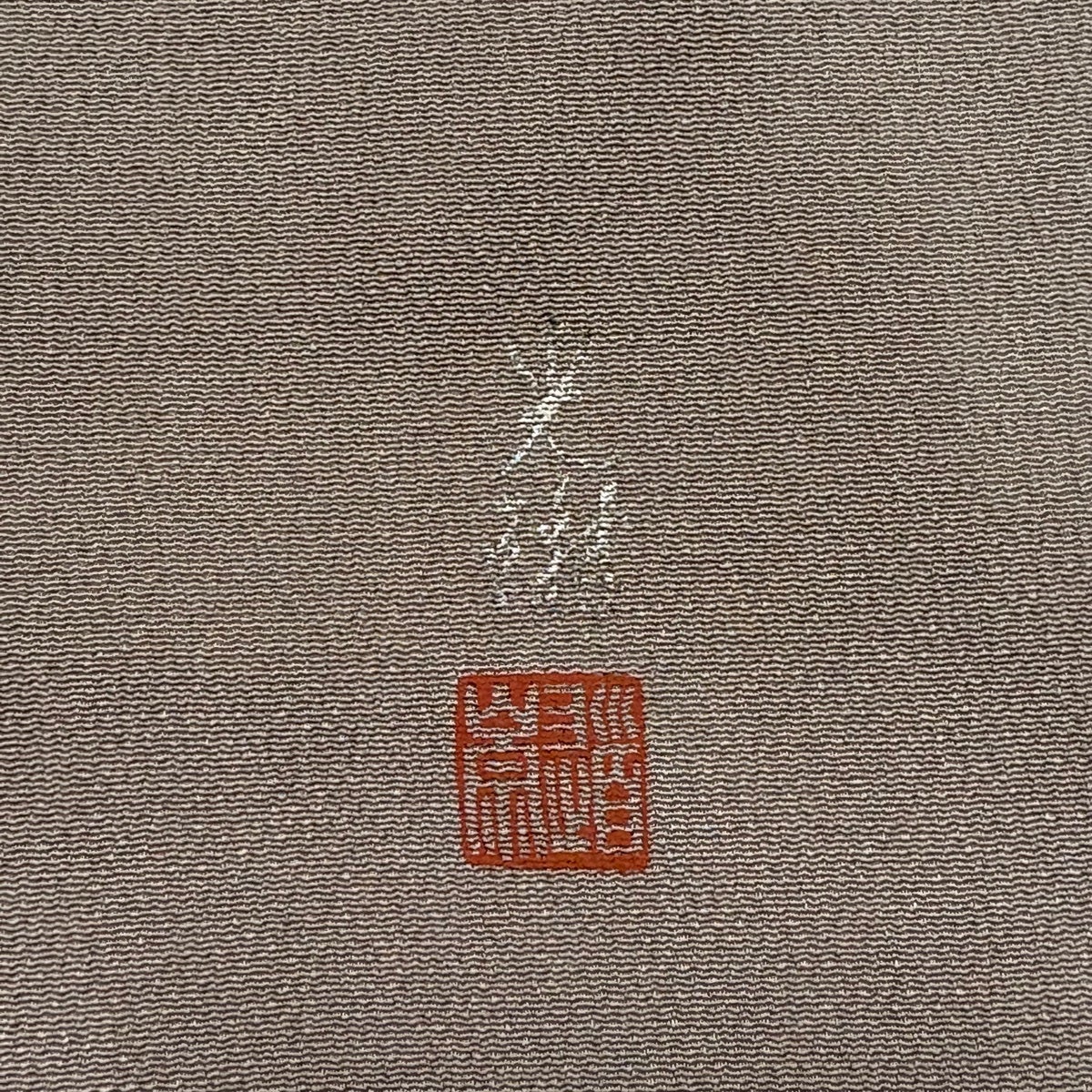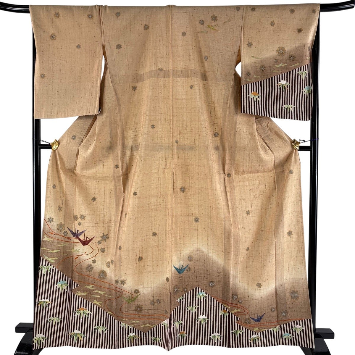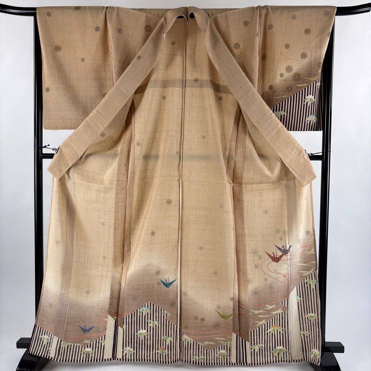 付下げ 身丈167.5cm 裄丈68cm L 単衣 紬地 折り鶴 縞 銀彩 ぼかし 薄茶色 正絹 名品