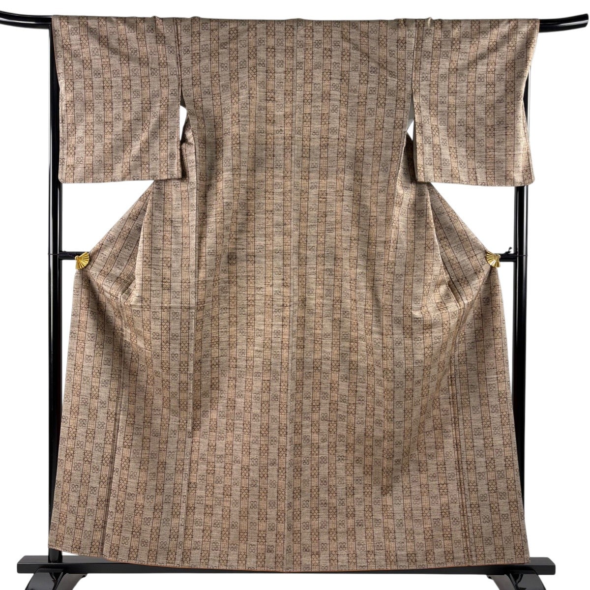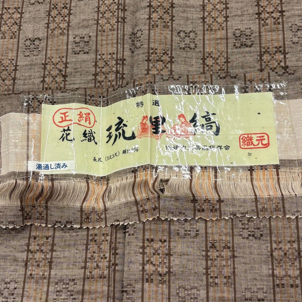 【美品】 紬 身丈159cm 裄丈67cm M 袷 花織 証紙あり 琉里縞 幾何学 灰茶 正絹 名品