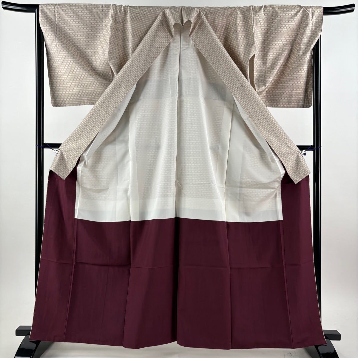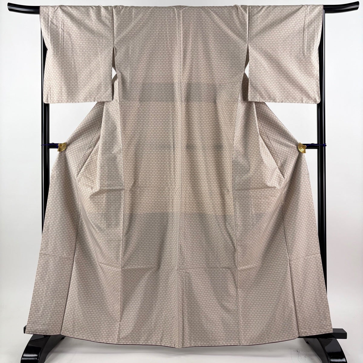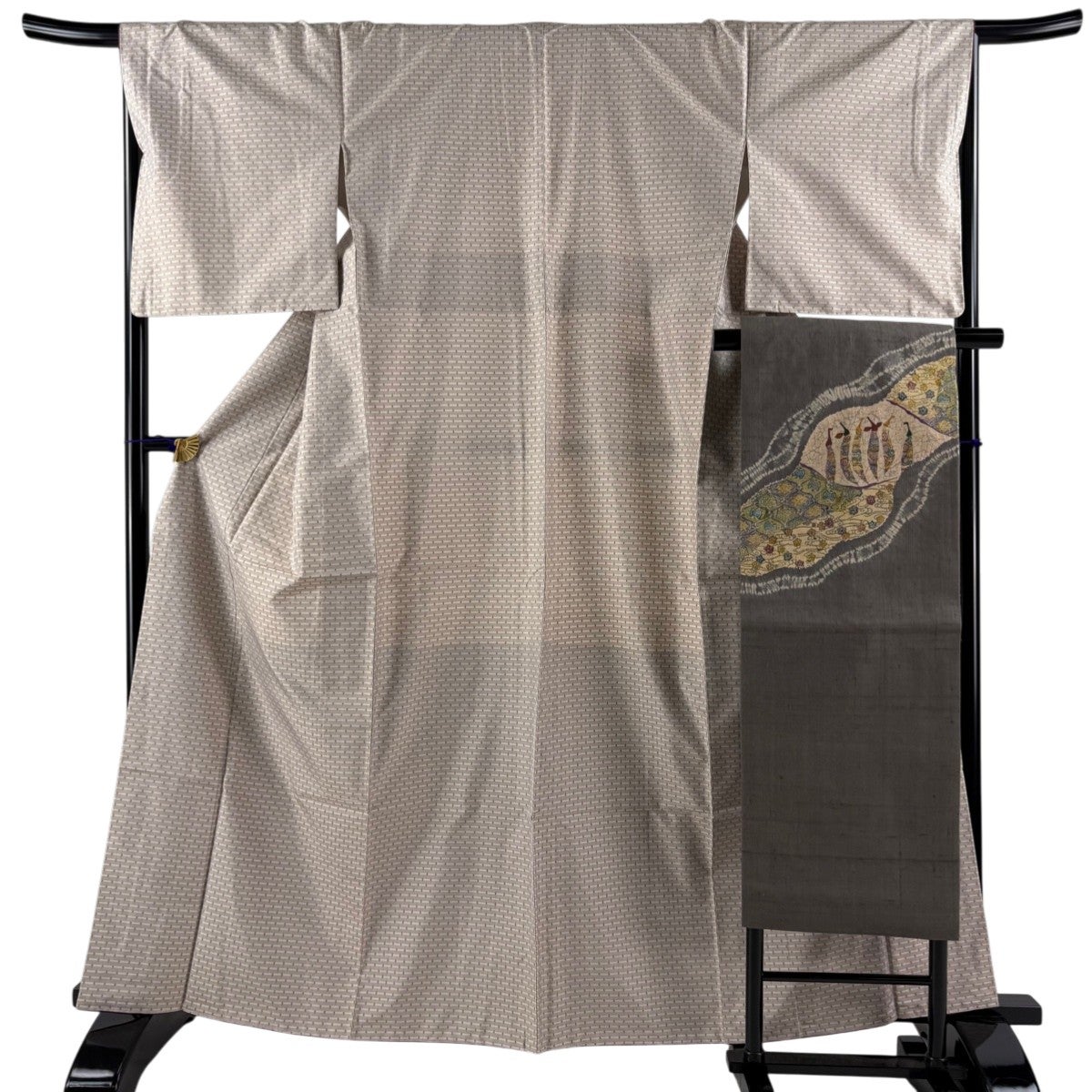 【美品】 お召 身丈162cm 裄丈67cm M 袷 袋帯セット 市松 幾何学 灰色 正絹 名品