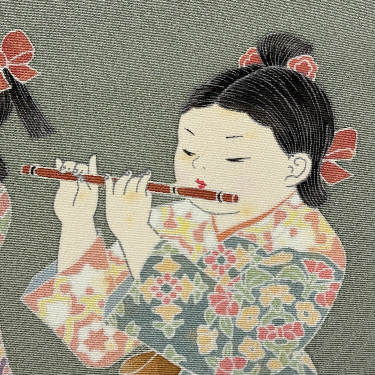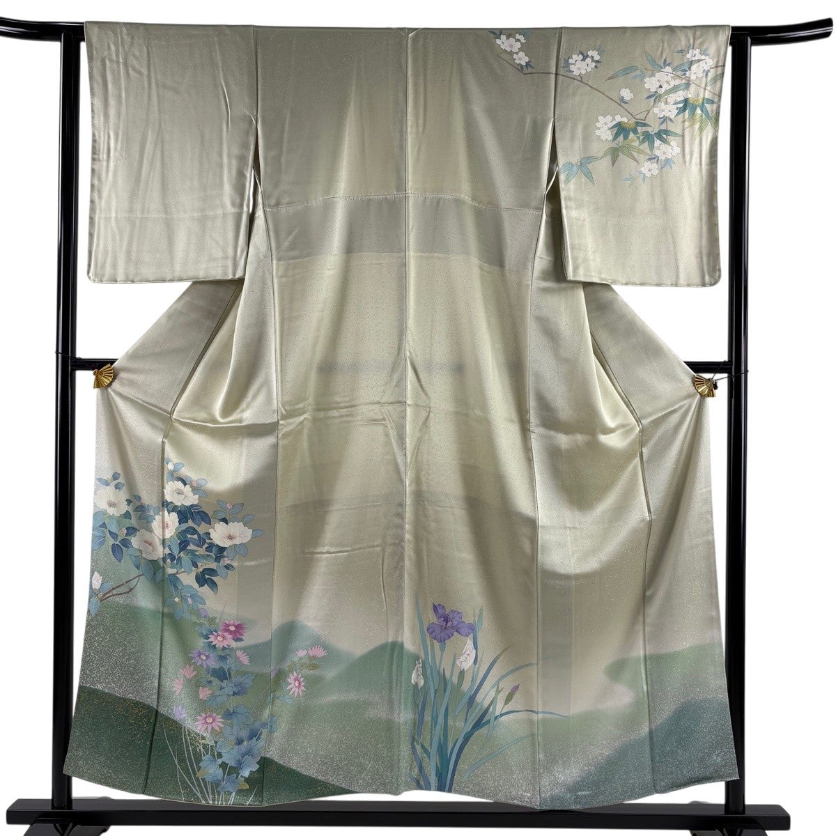 訪問着 身丈154.5cm 裄丈64cm M 袷 関口遼一 落款あり 童 桜 染め分け 灰緑 正絹 名品
