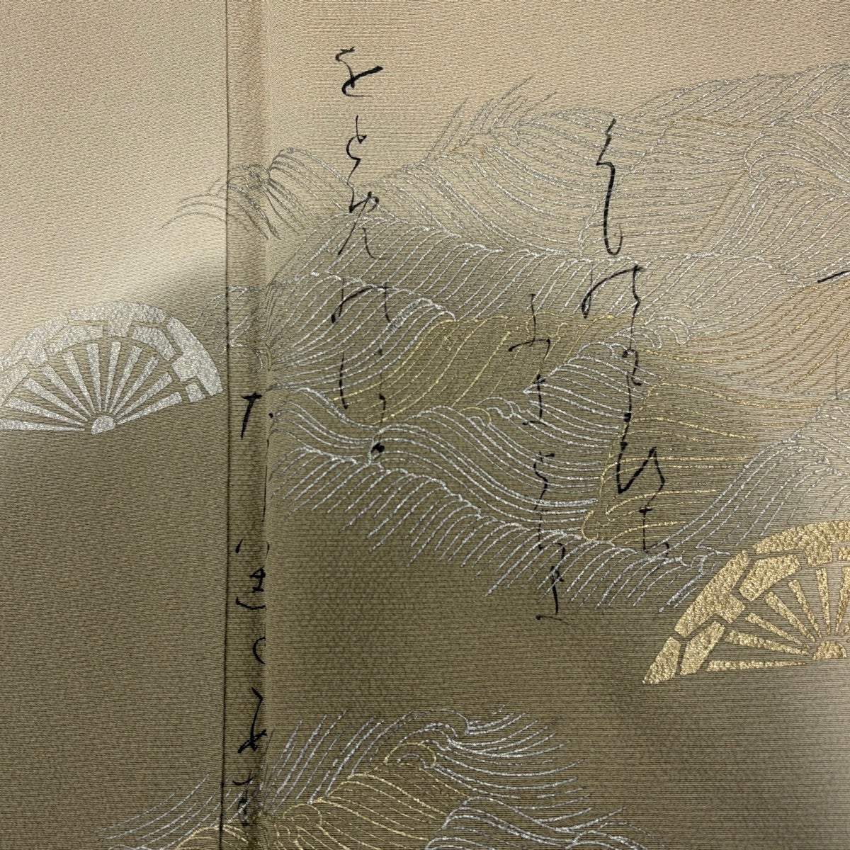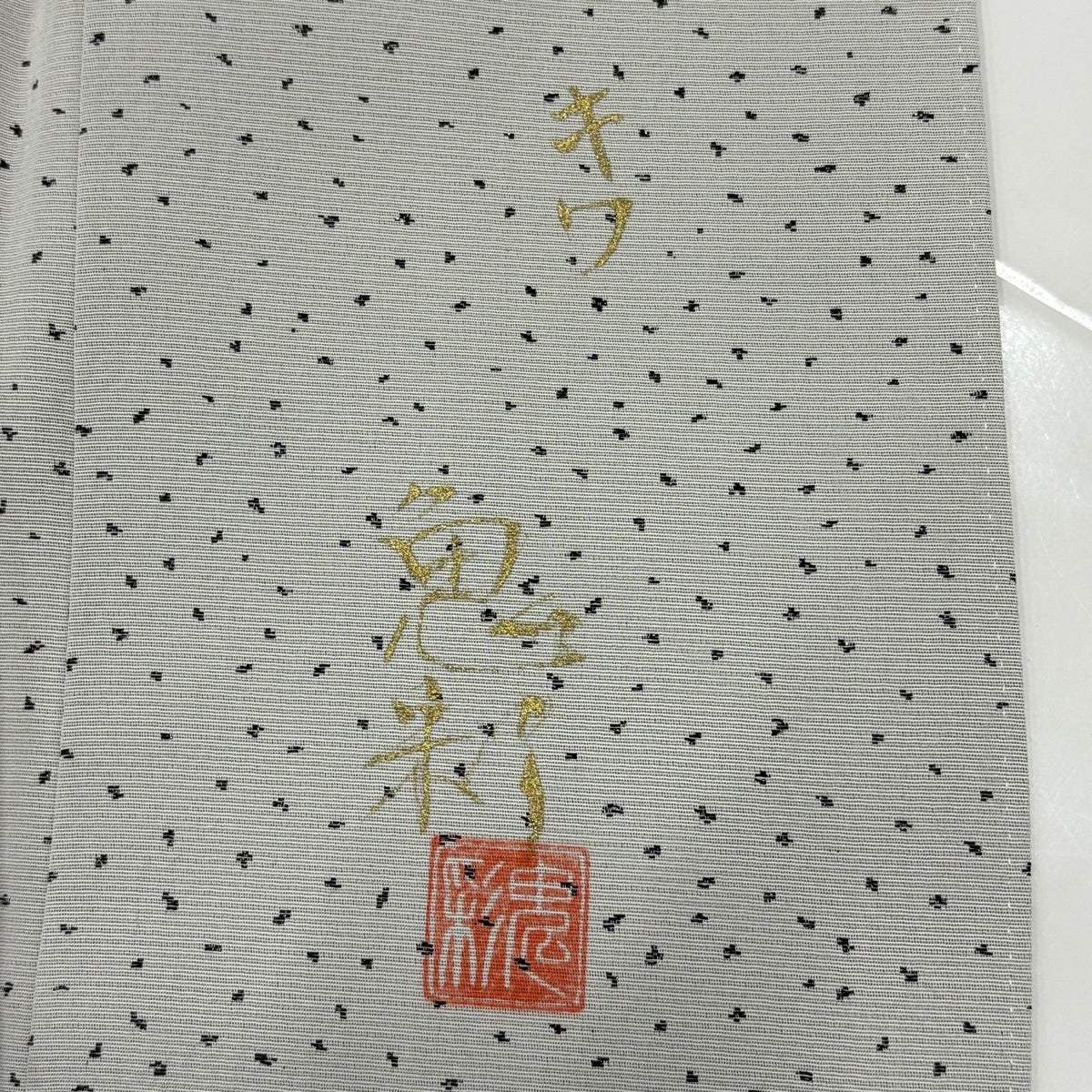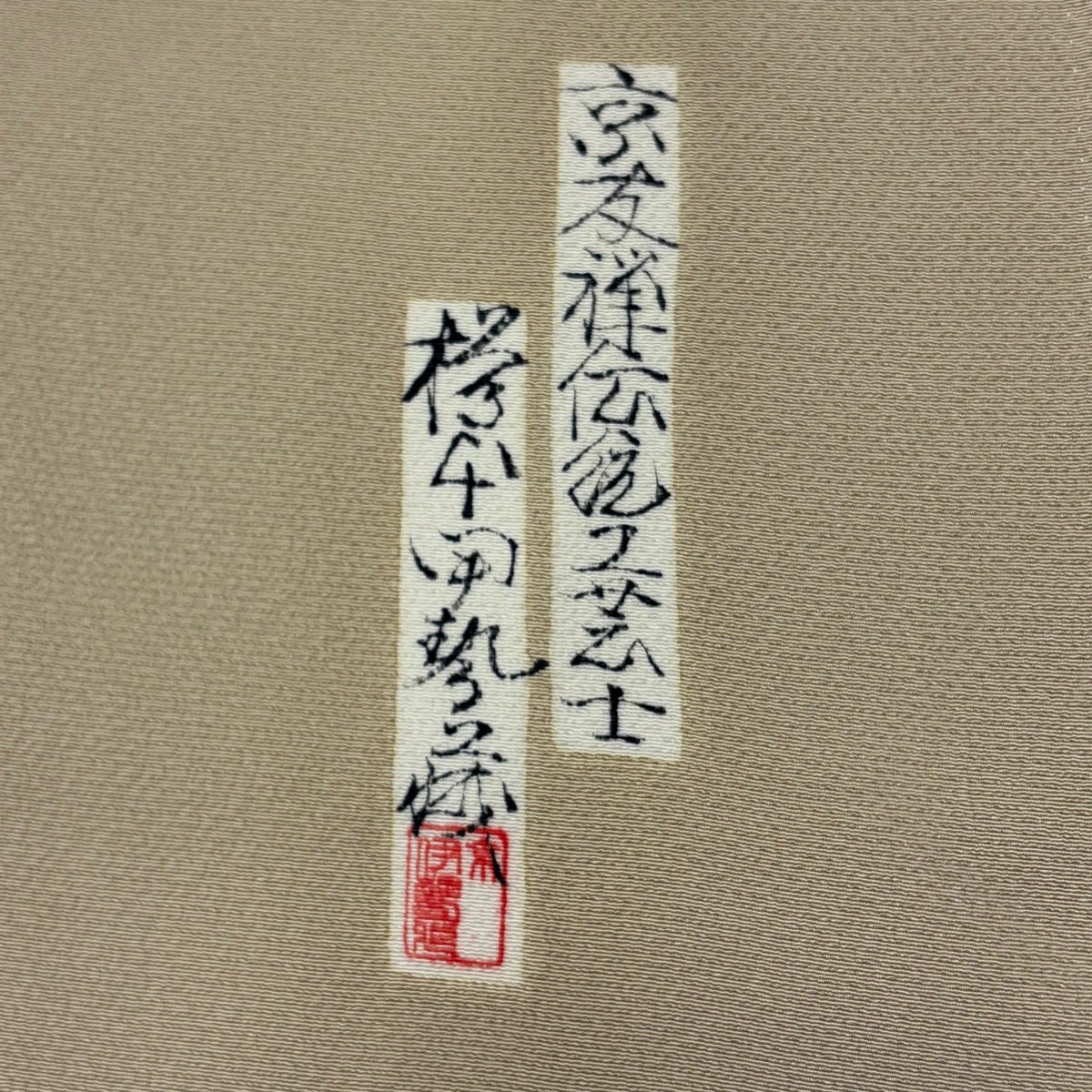 【美品】 付下げ 身丈157cm 裄丈65cm M 袷 樽本伊勢蔵 落款あり 文字文 片輪車 金銀彩 ぼかし 薄茶色 正絹 名品