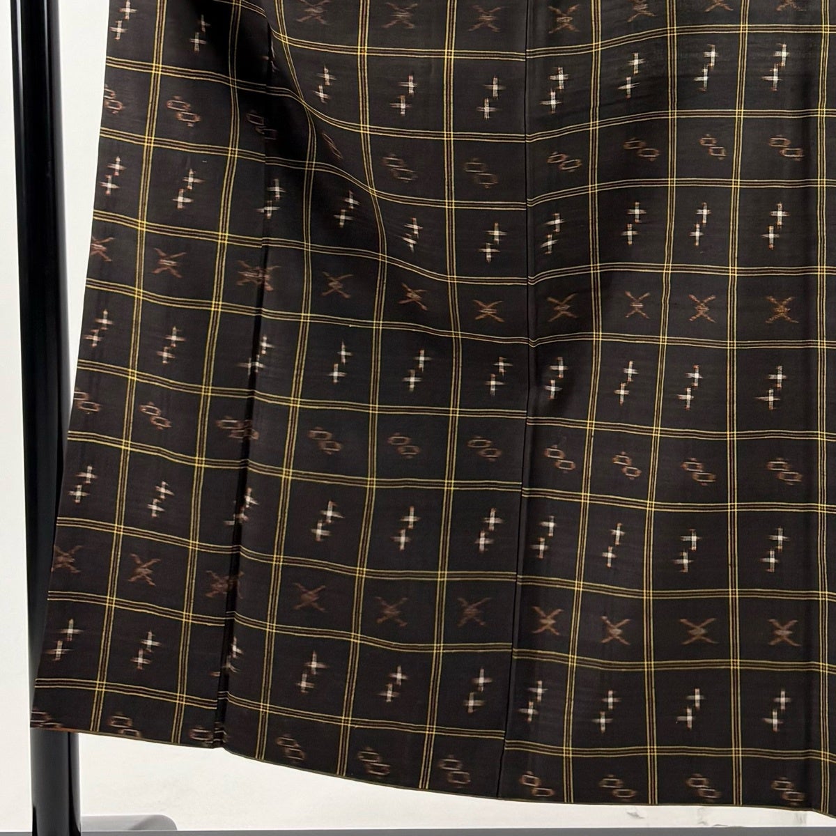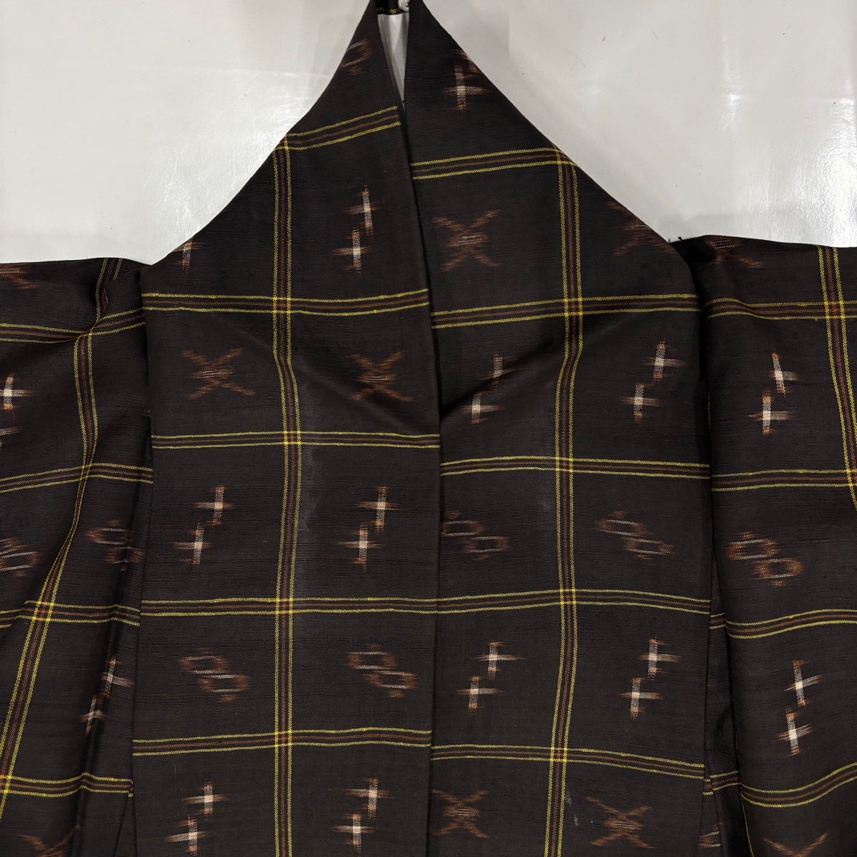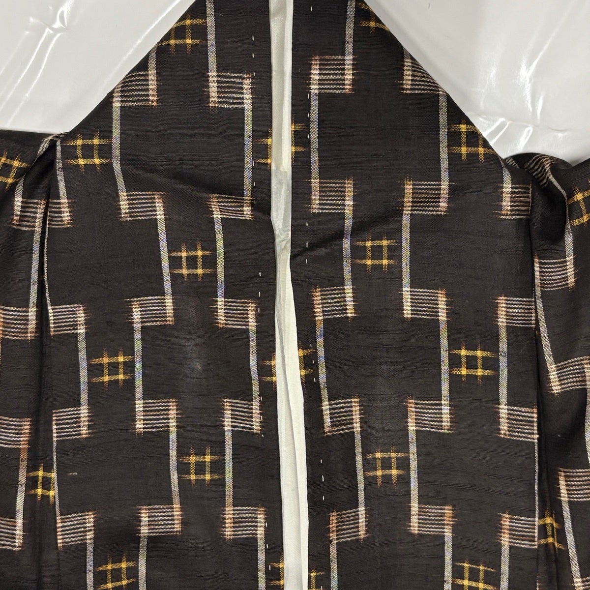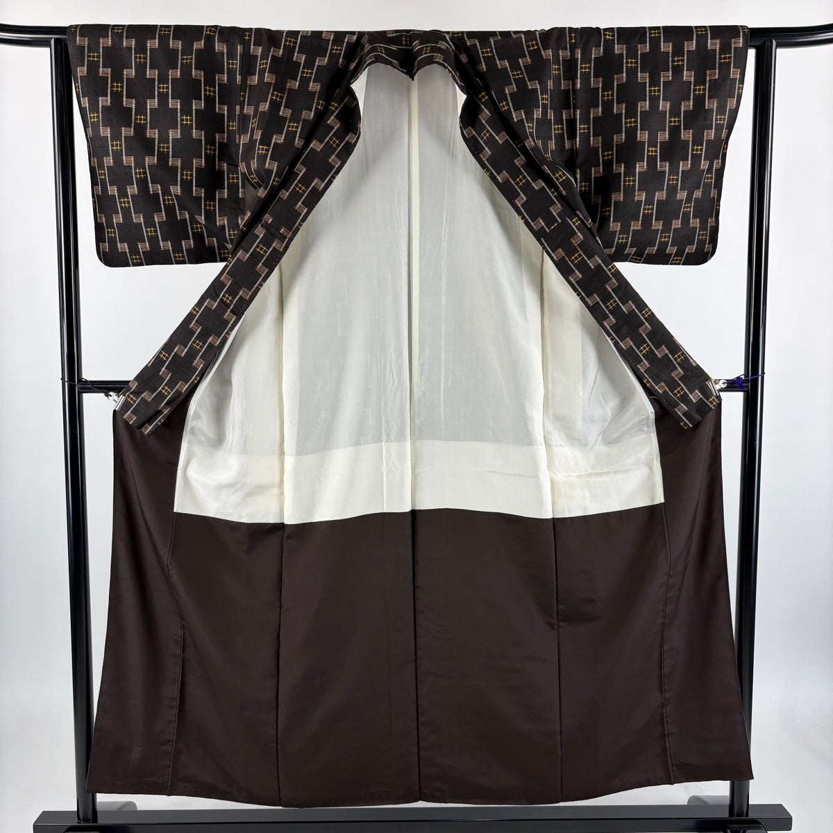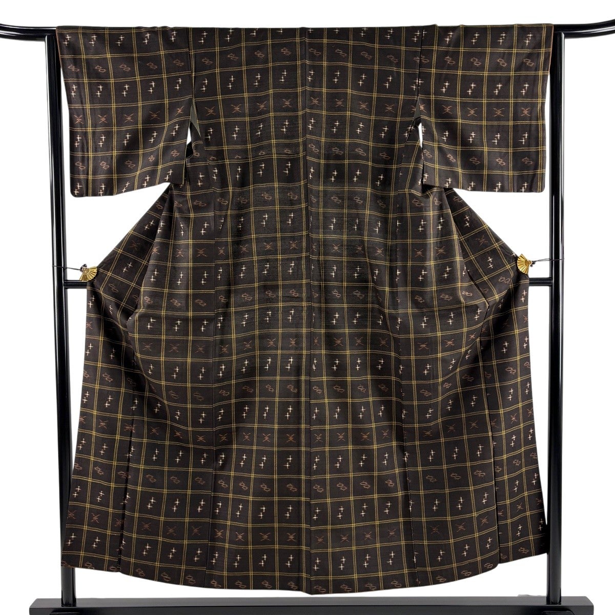 【美品】 紬 身丈154cm 裄丈63cm S 袷 井桁絣 幾何学 焦茶色 正絹 名品