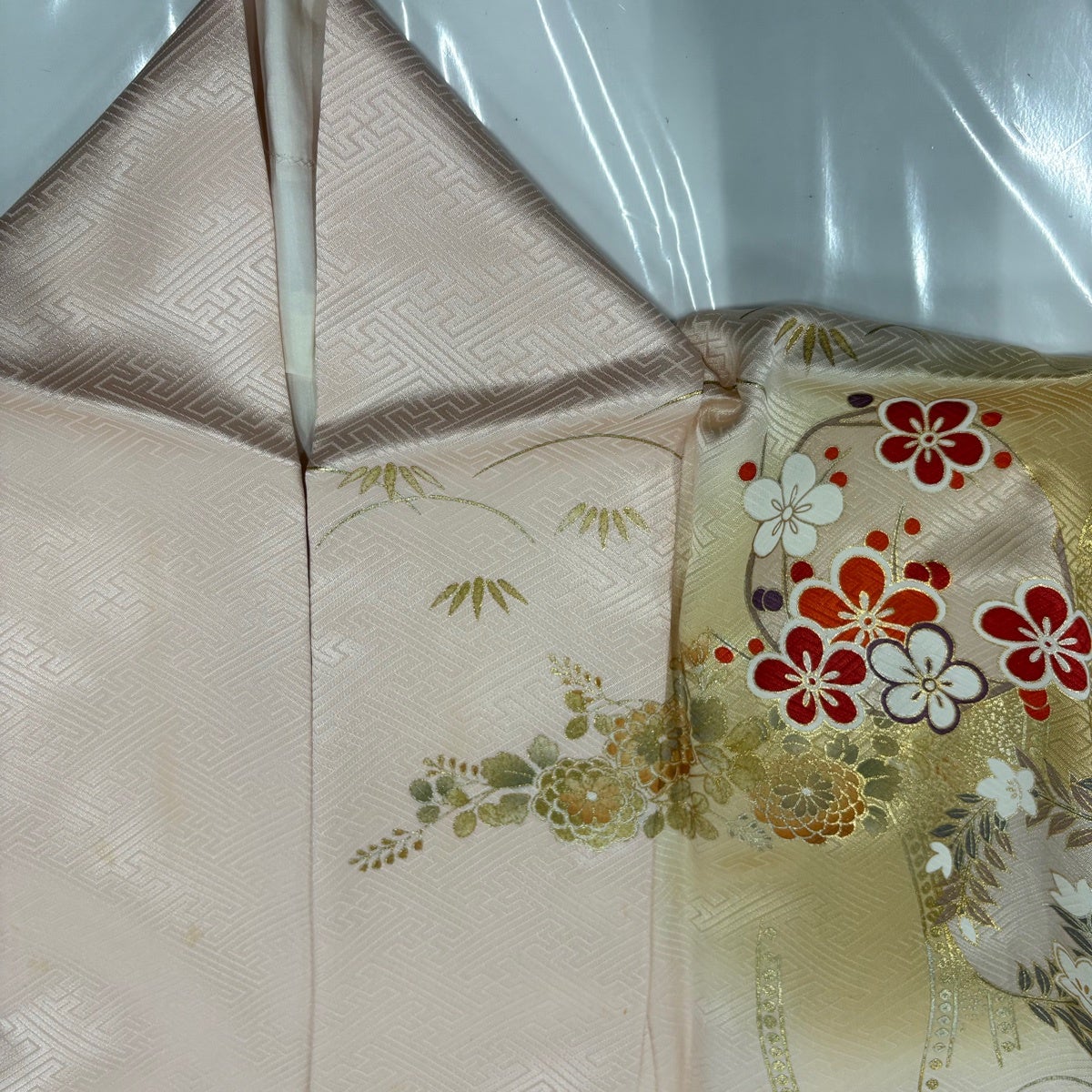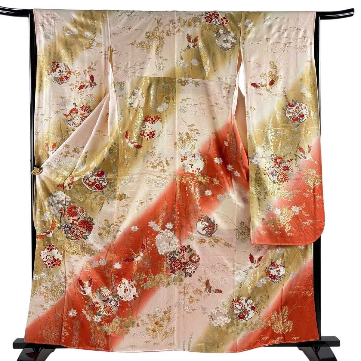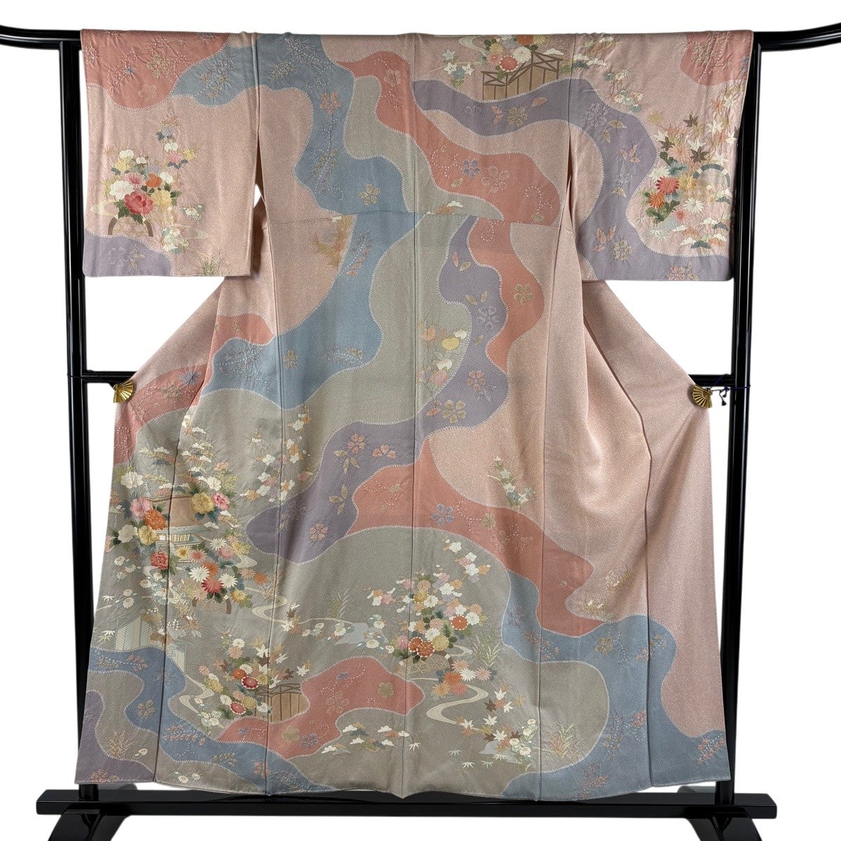 訪問着 身丈157.5cm 裄丈64cm M 袷 草花 流水 金彩 ぼかし ピンク 正絹 秀品