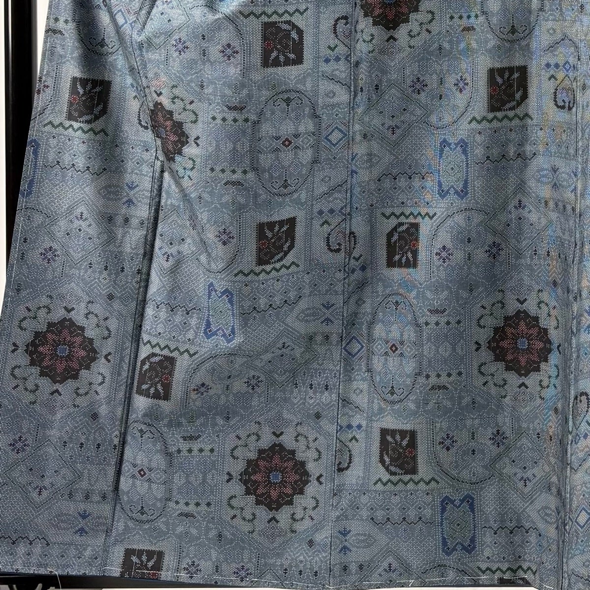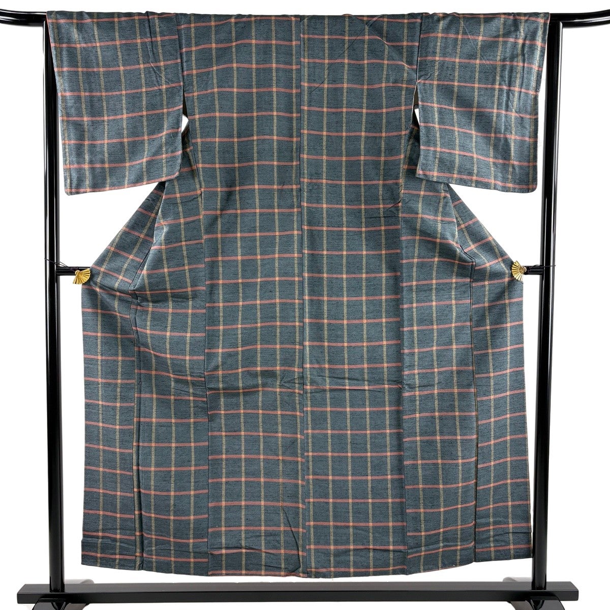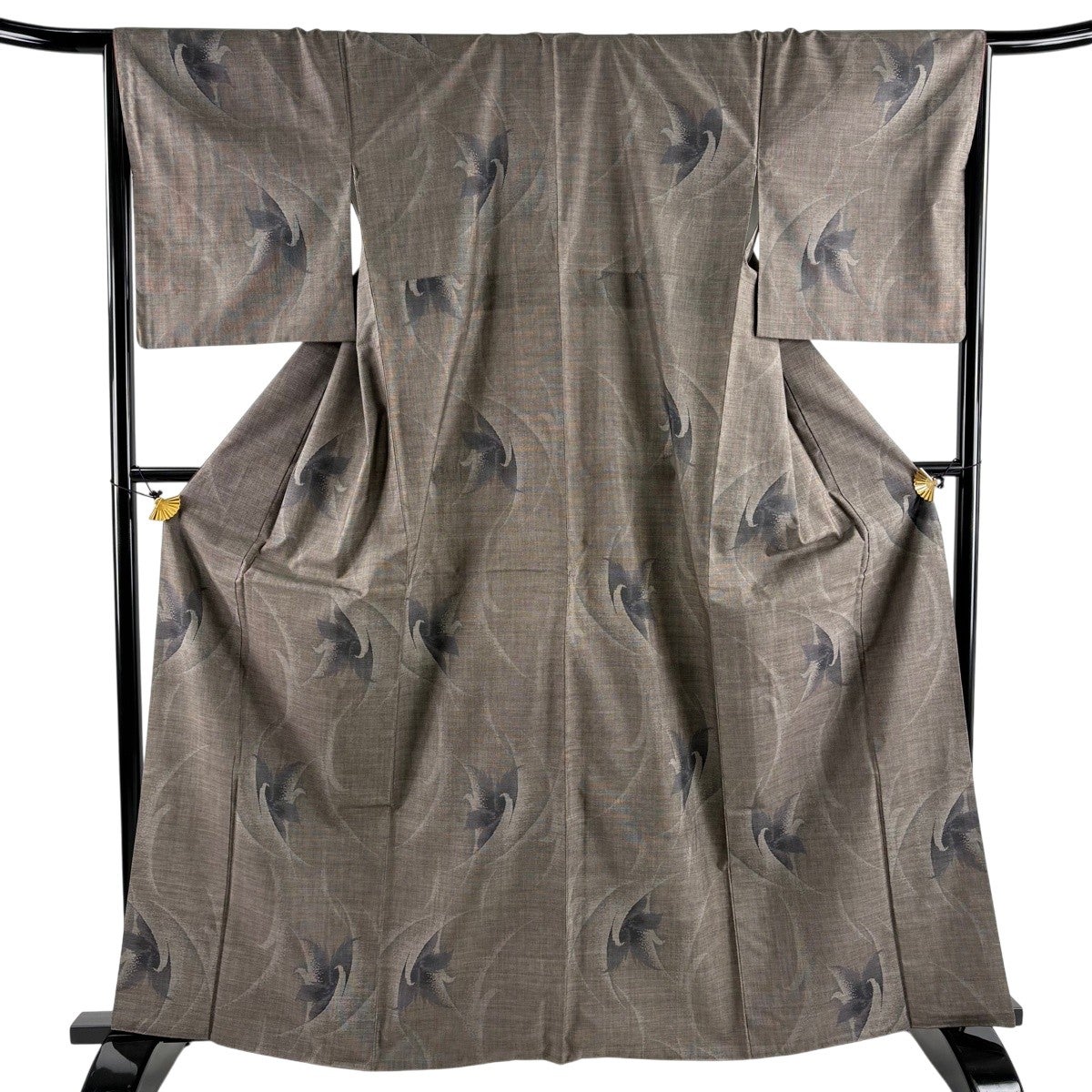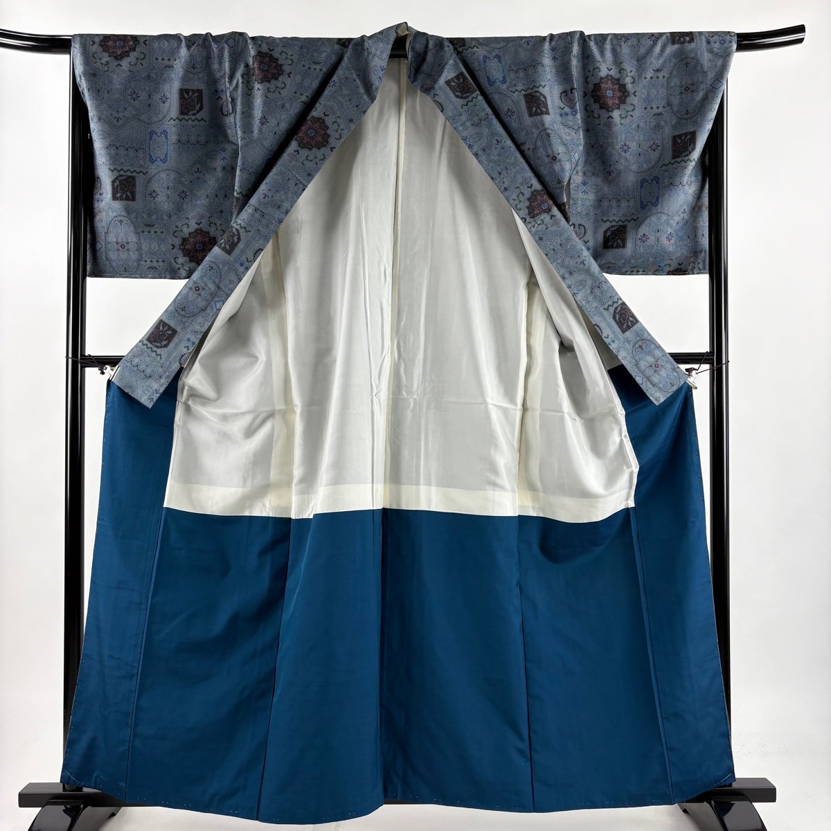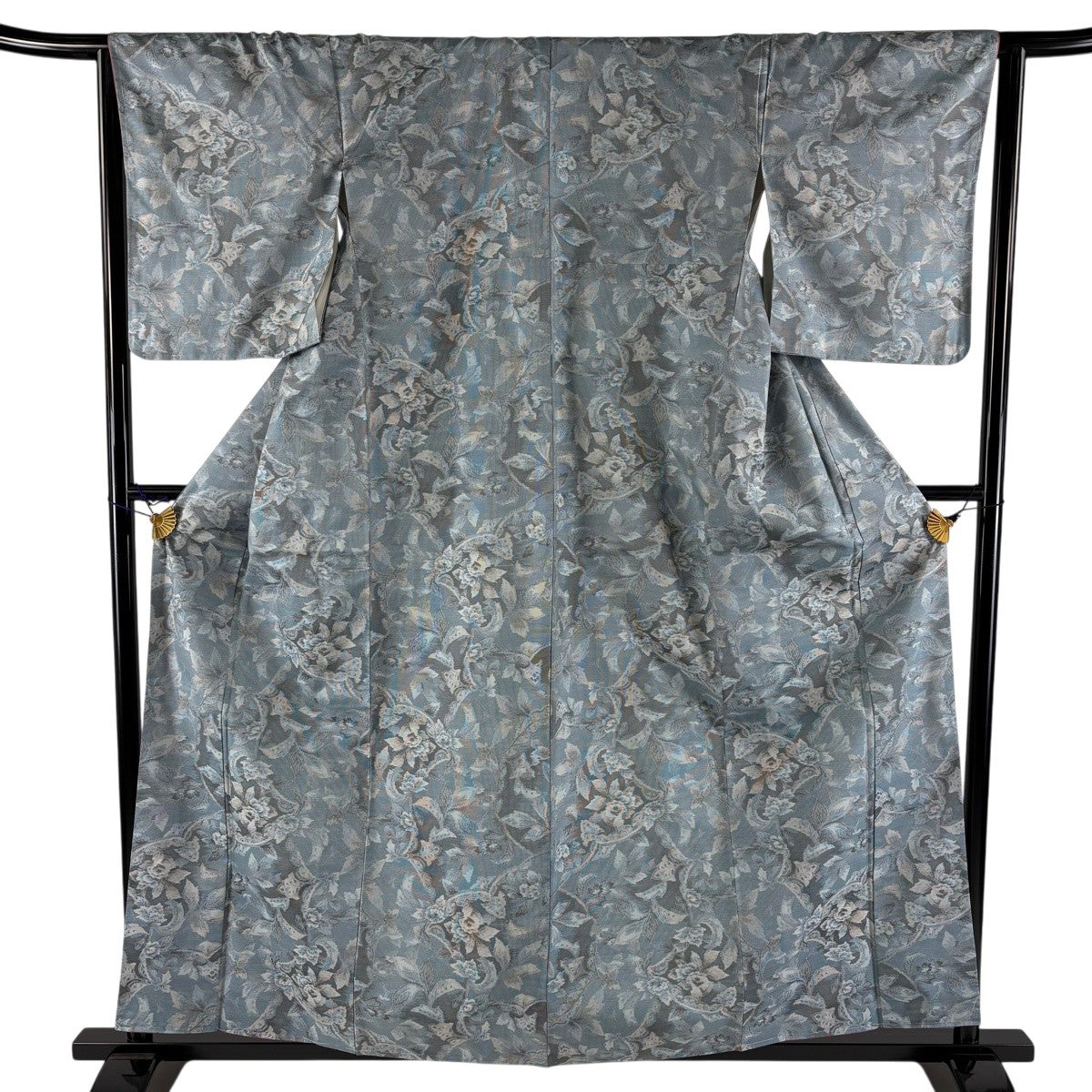 大島紬 身丈158.5cm 裄丈65cm M 袷 都喜ヱ門 証紙あり 草花+ 青灰色 正絹 名品