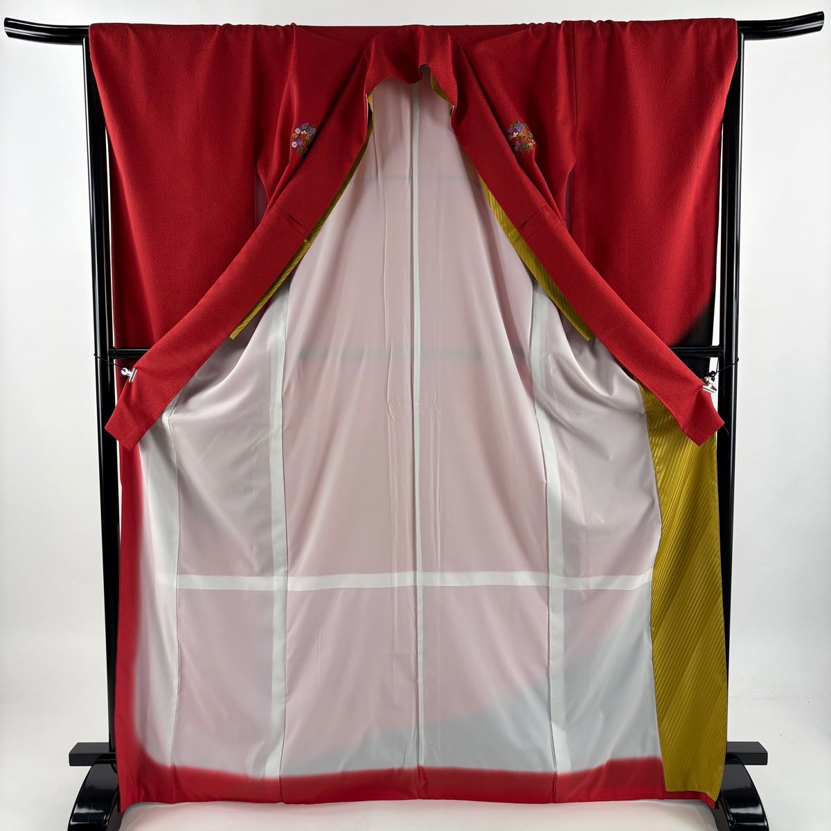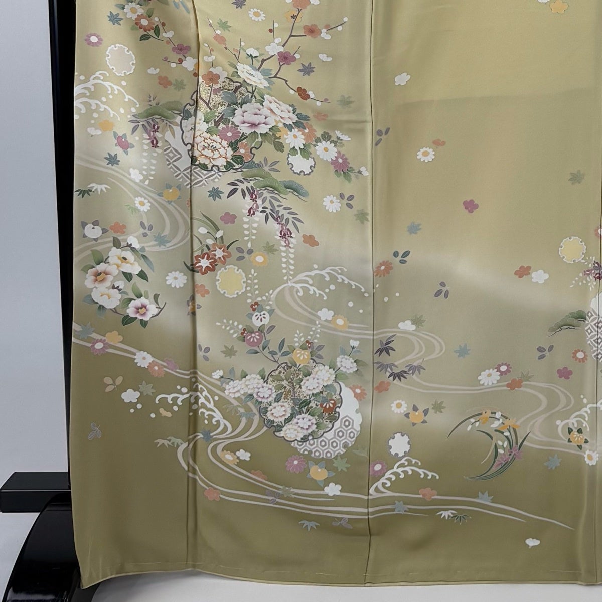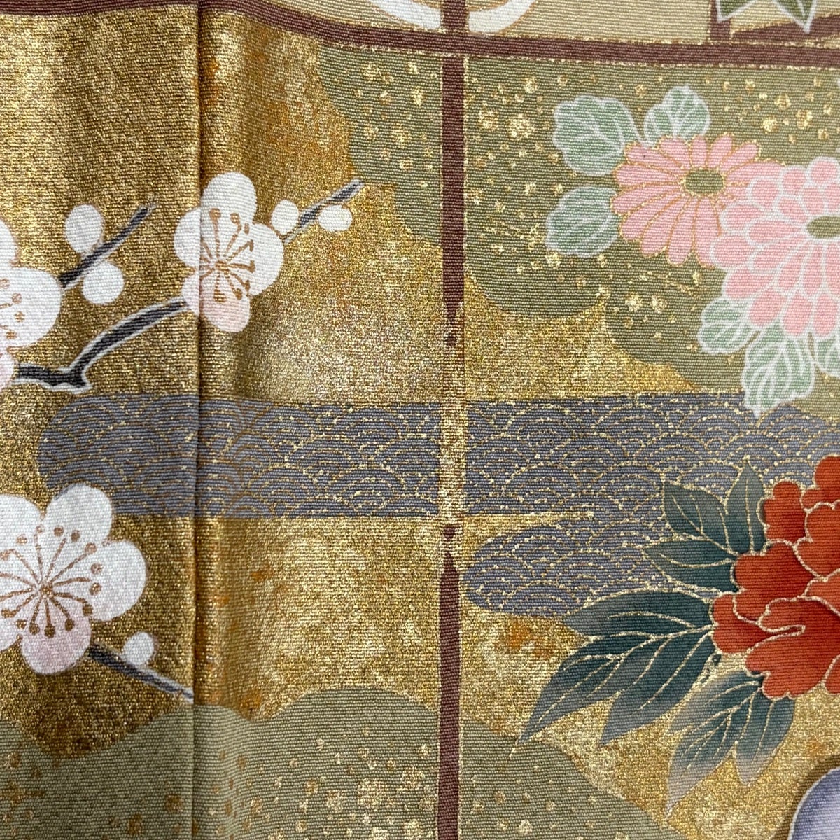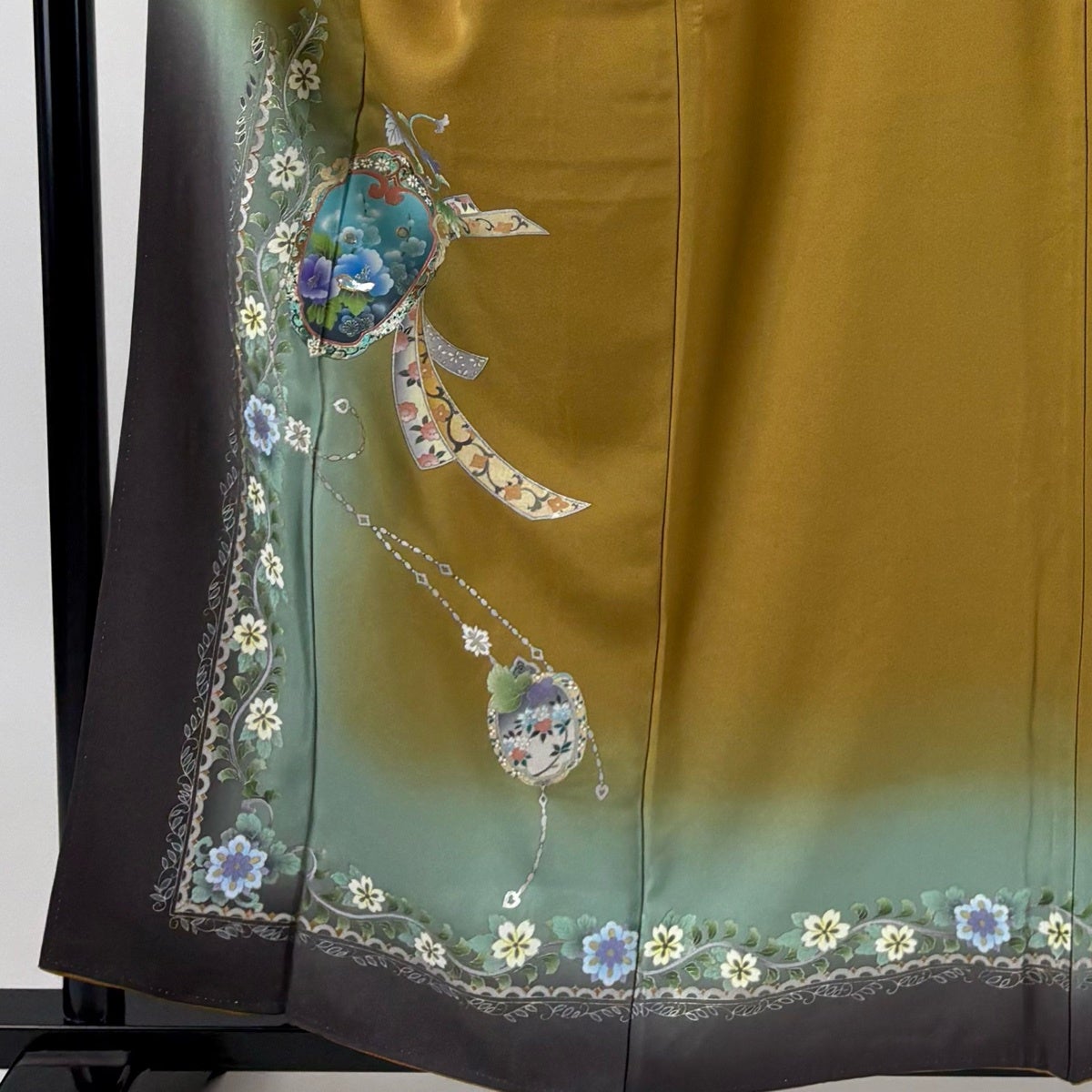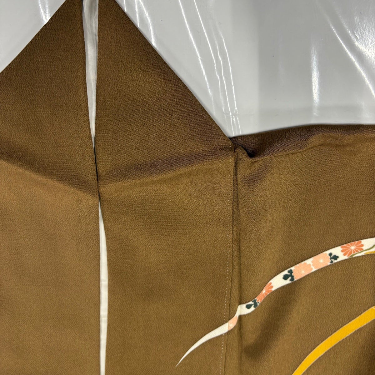 付下げ 身丈158cm 裄丈64.5cm M 袷 草花 熨斗 金銀彩 螺鈿 山吹茶色 正絹 名品
