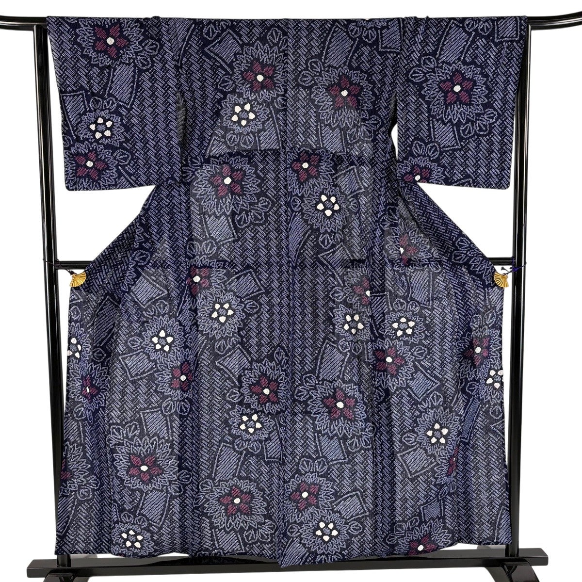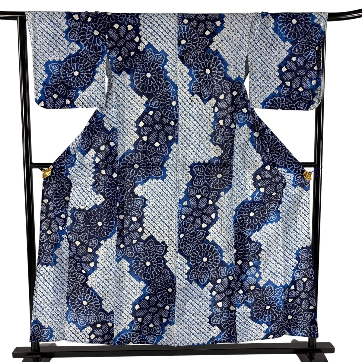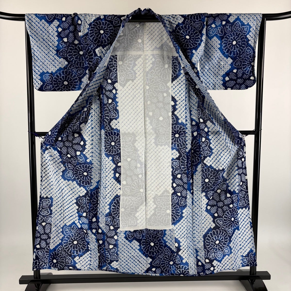【美品】 浴衣 身丈154cm 裄丈67cm M 絞り浴衣 花 亀甲 濃紺 綿 名品
