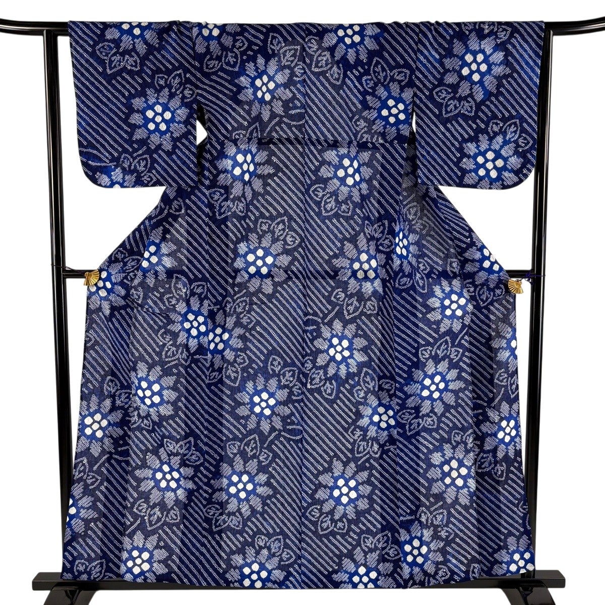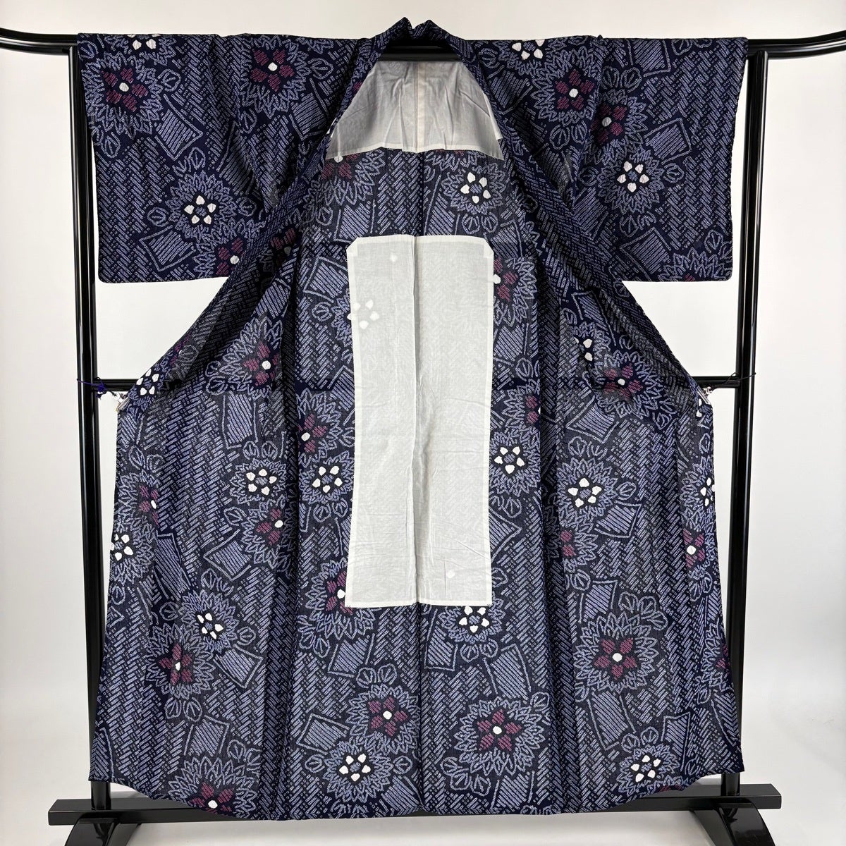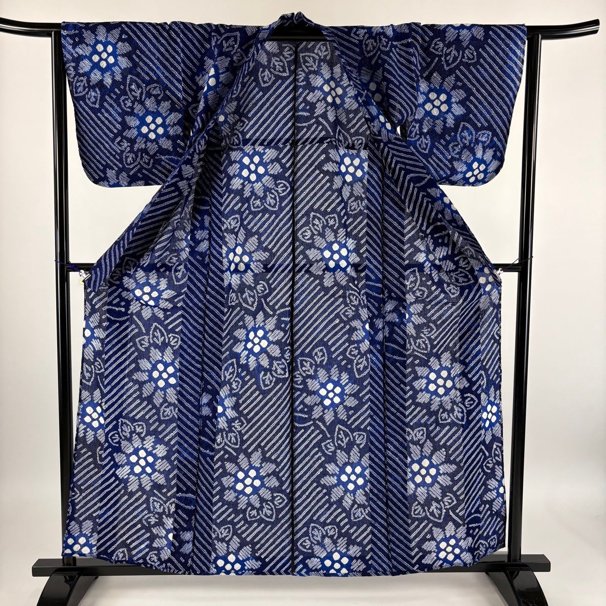 【美品】 浴衣 身丈159.5cm 裄丈64cm M 絞り浴衣 草花 斜縞 紺色 綿 名品
