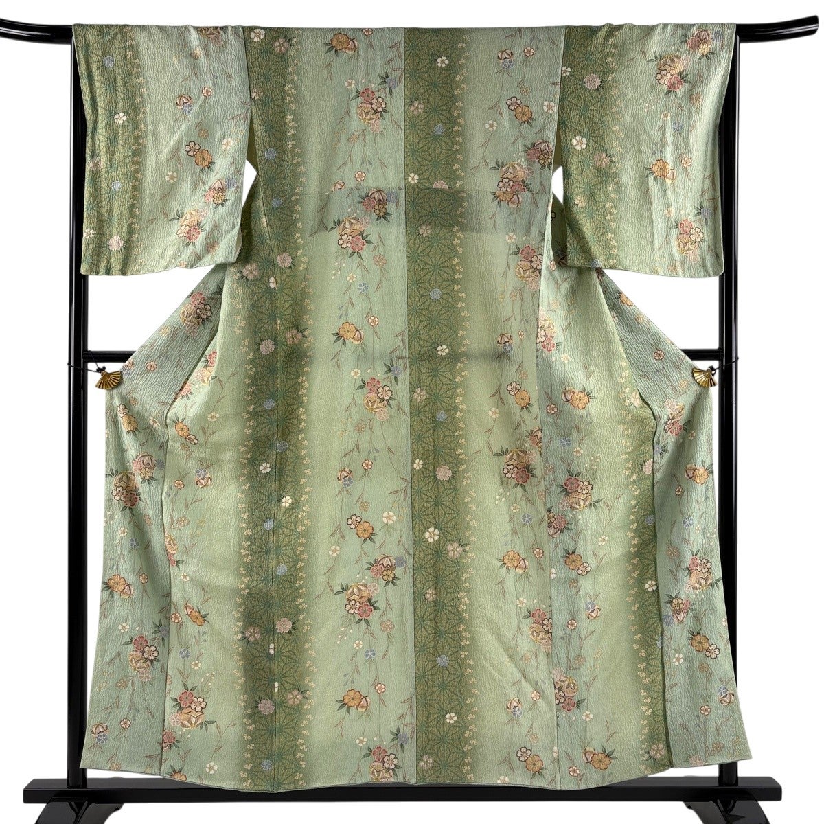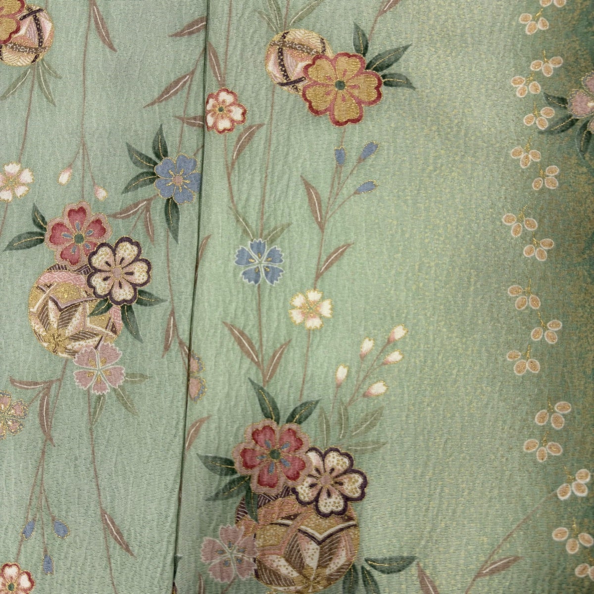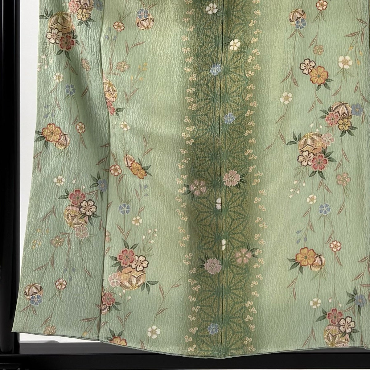 【美品】 小紋 身丈157.5cm 裄丈66cm M 袷 鞠 草花 金彩 ぼかし 薄緑 正絹 秀品