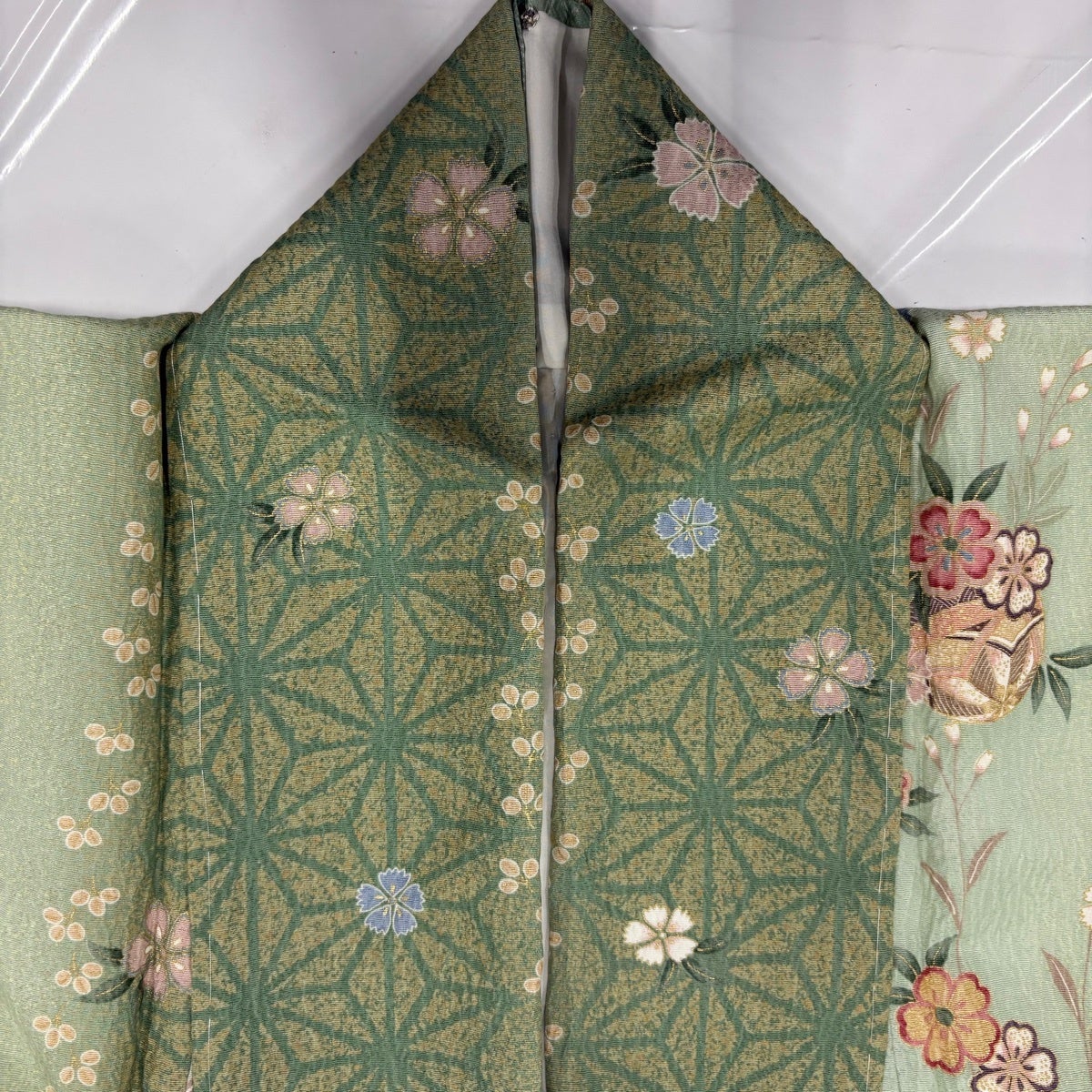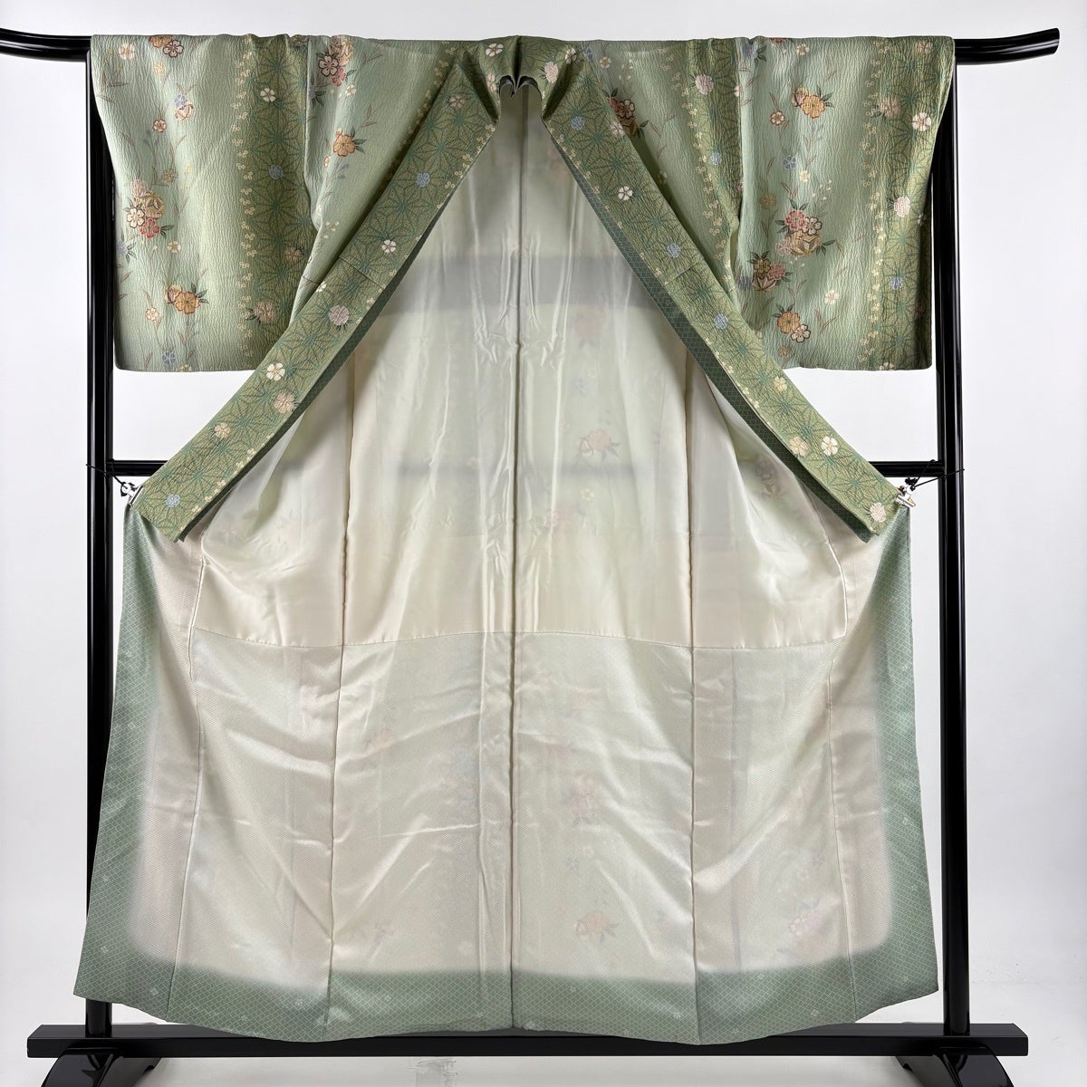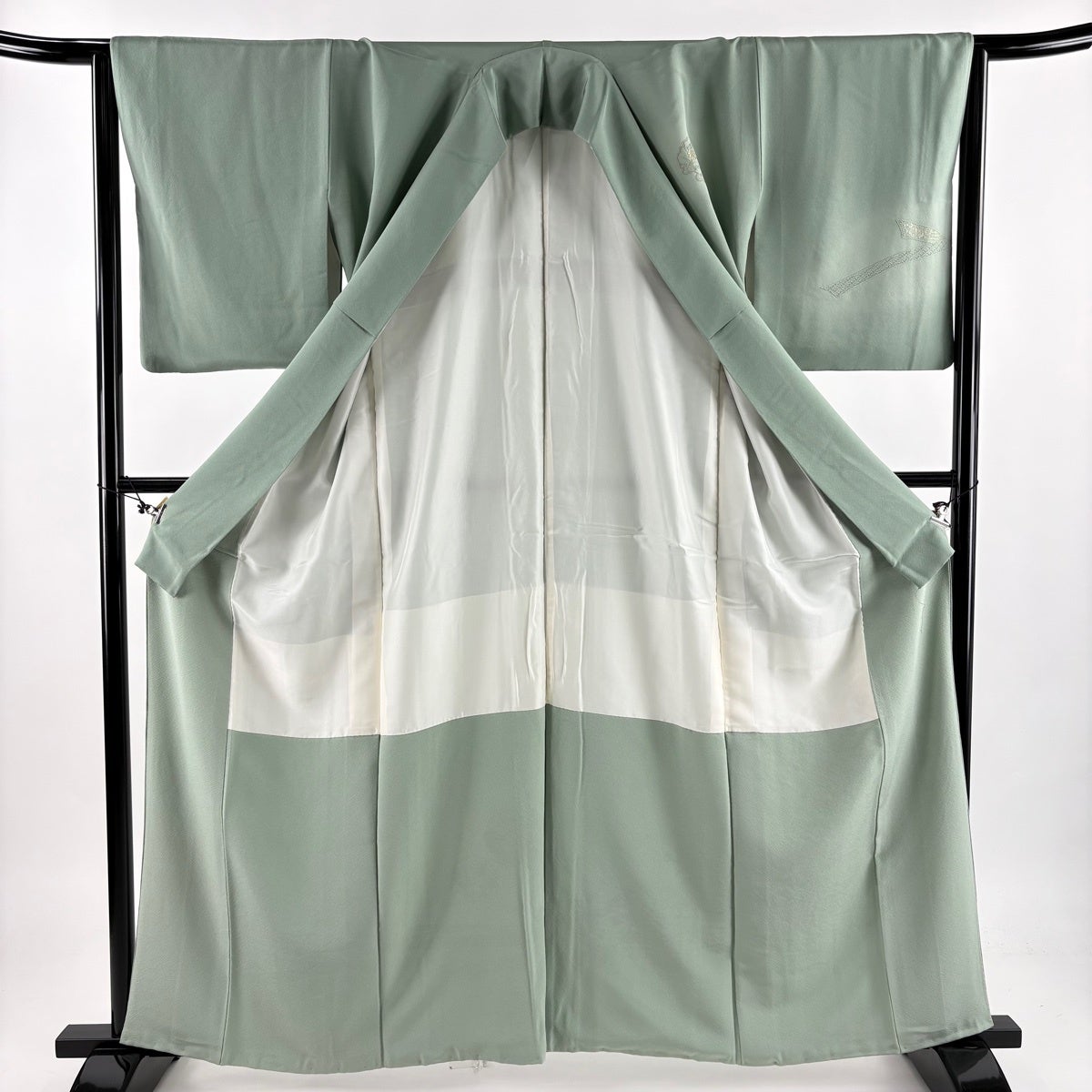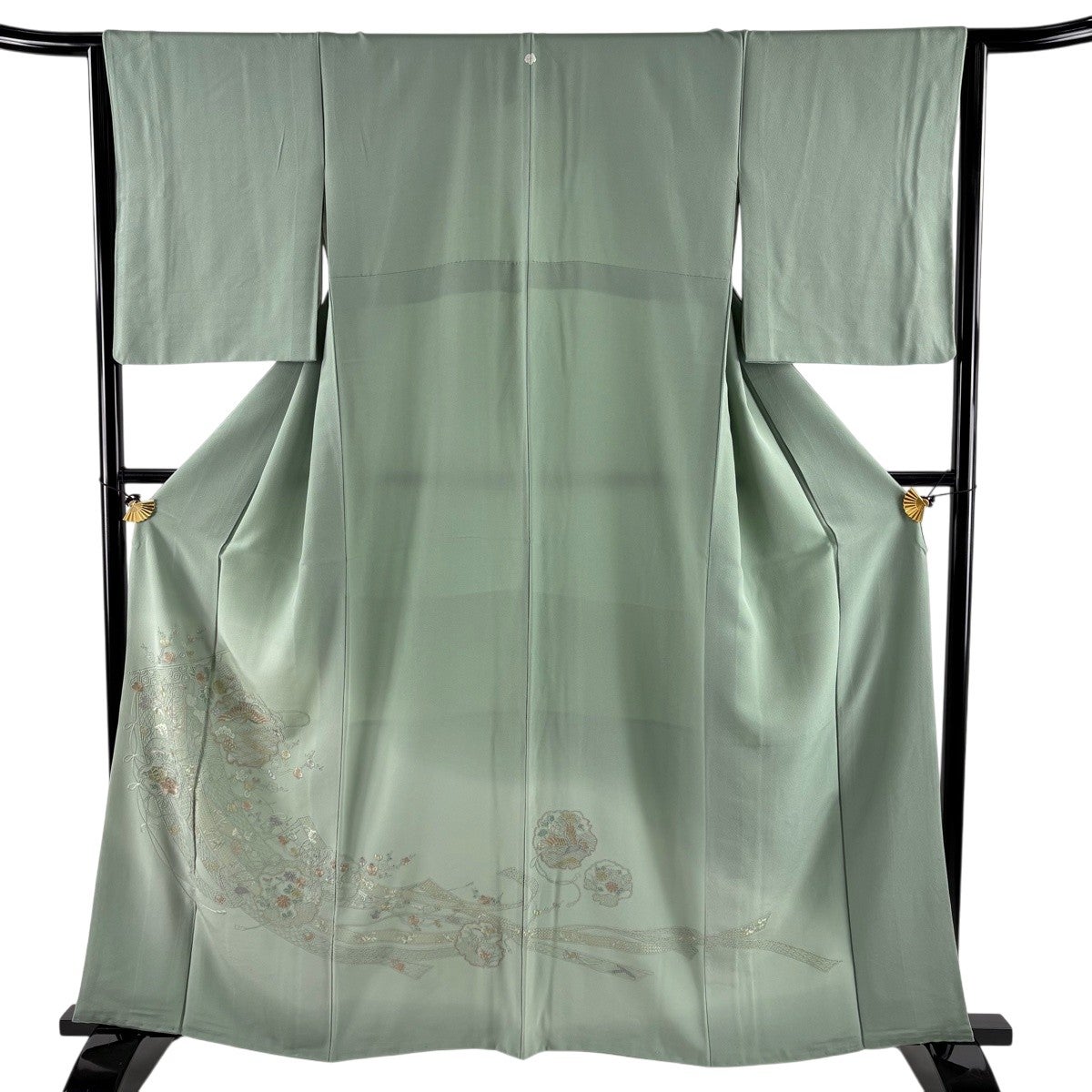 【美品】 小紋 身丈157.5cm 裄丈66cm M 袷 鞠 草花 金彩 ぼかし 薄緑 正絹 秀品