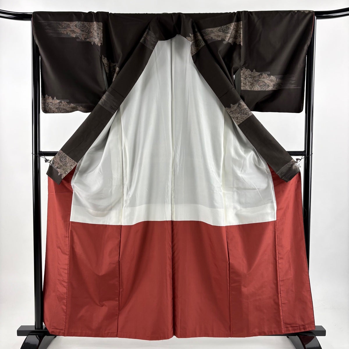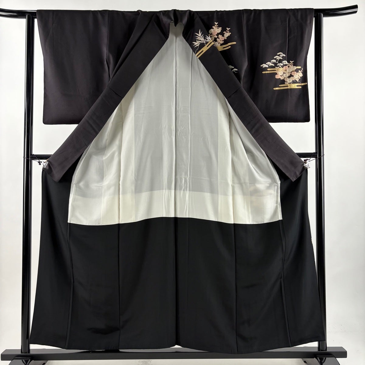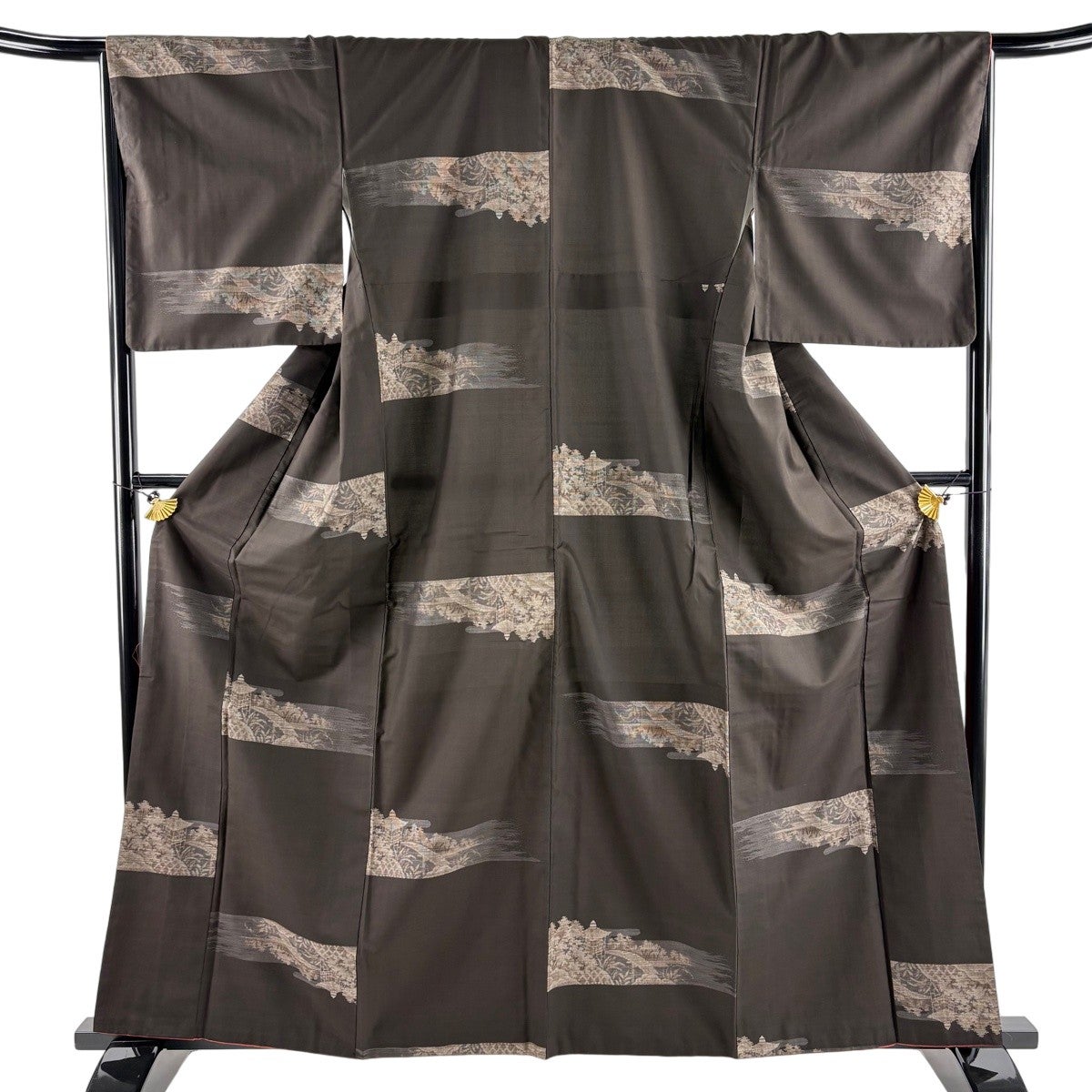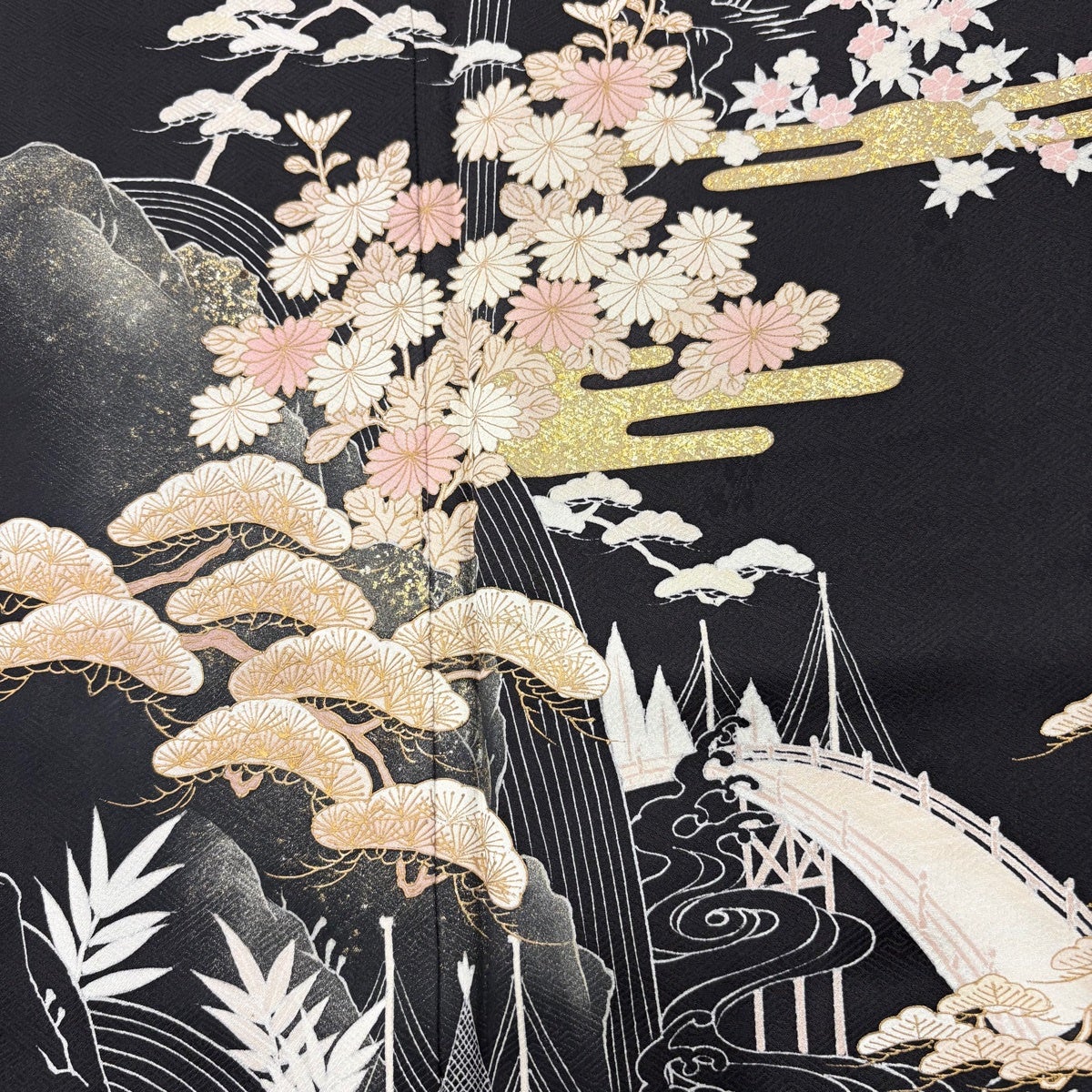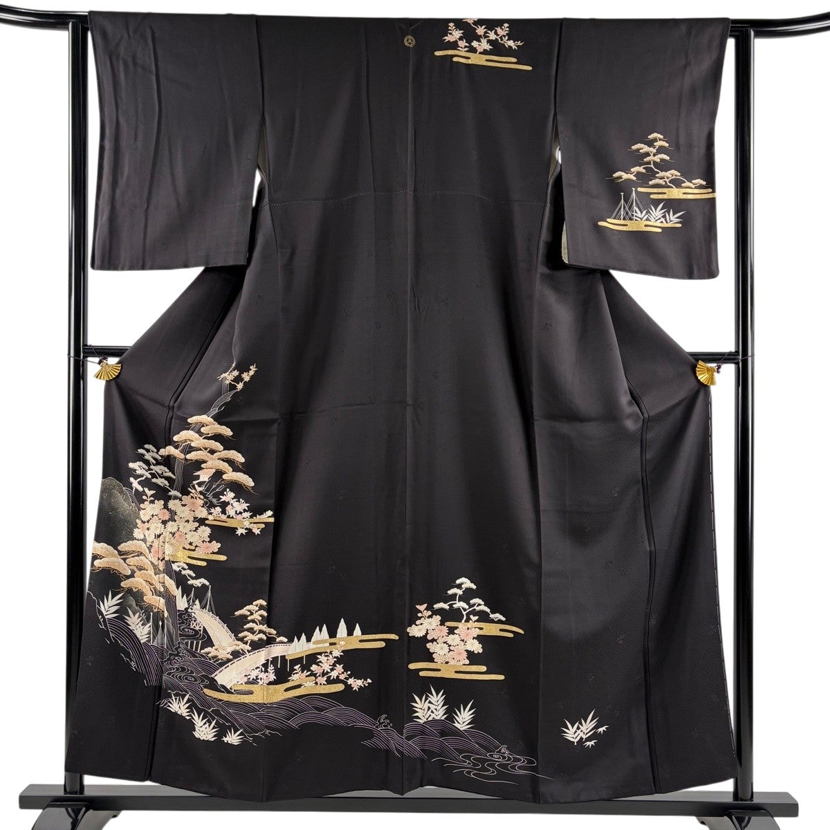 訪問着 身丈158cm 裄丈62.5cm S 袷 橋 松 金彩 墨色 正絹 秀品 一つ紋