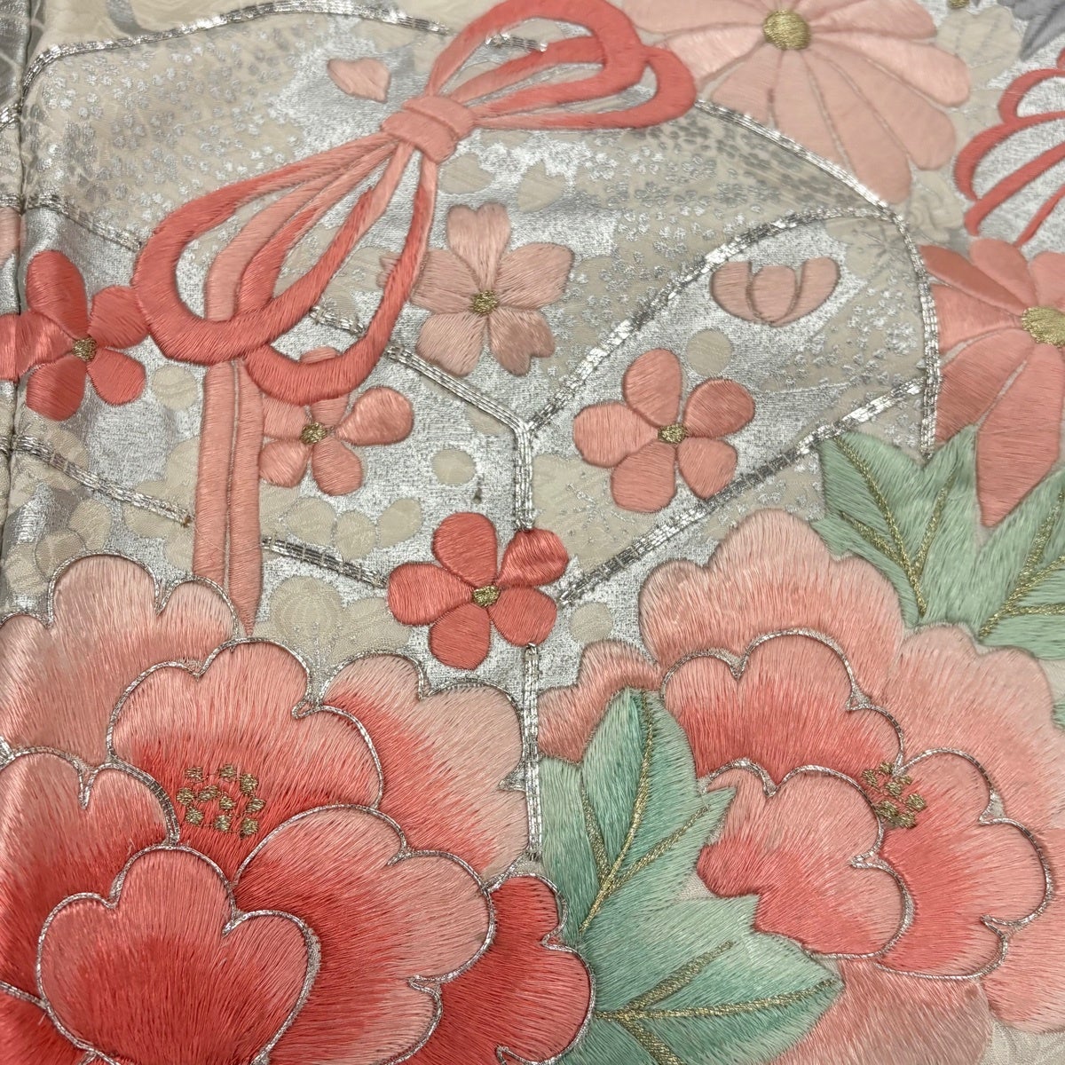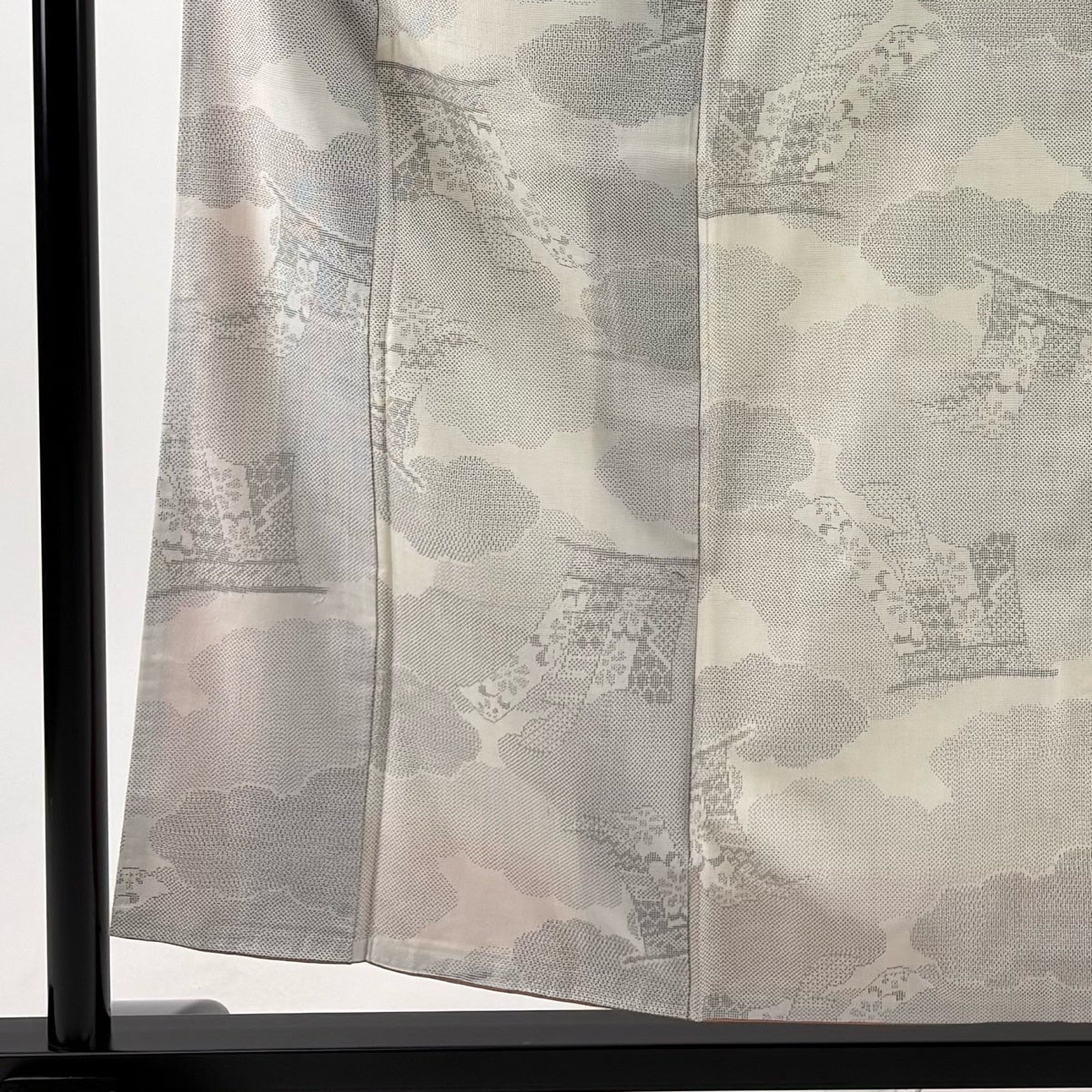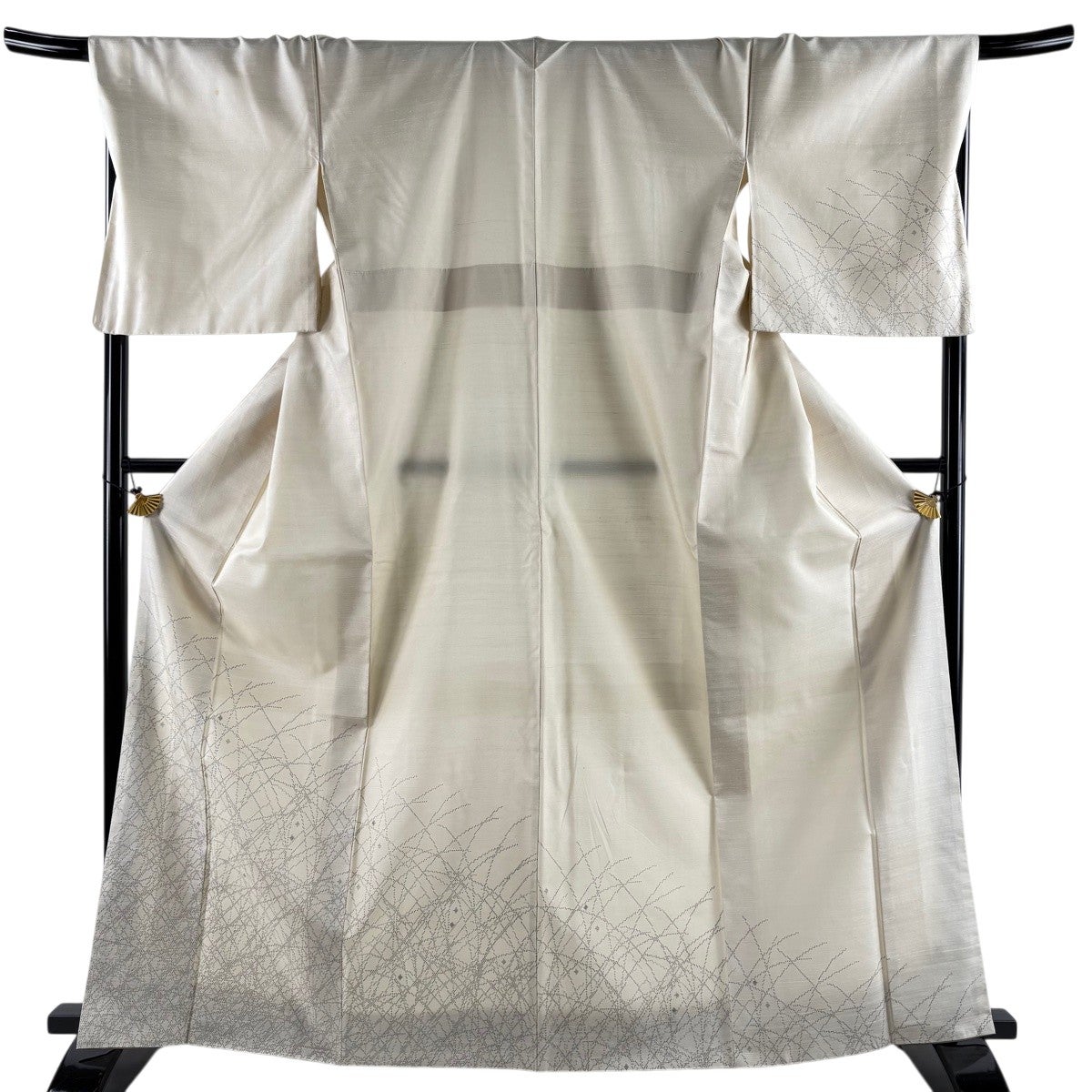 付下げ 身丈165cm 裄丈66.5cm M 袷 短冊 桜 刺繍 銀彩 クリーム 正絹 秀品