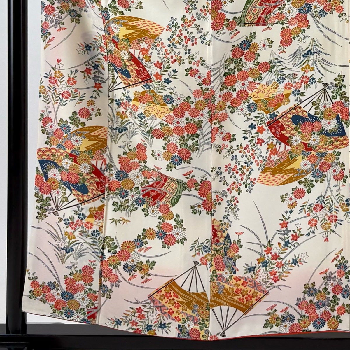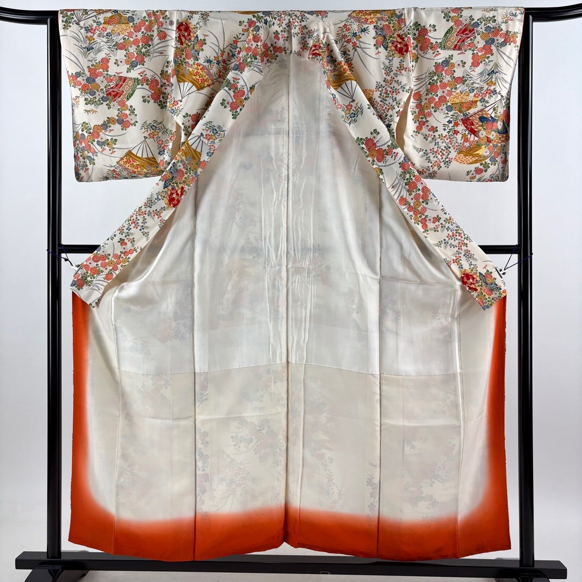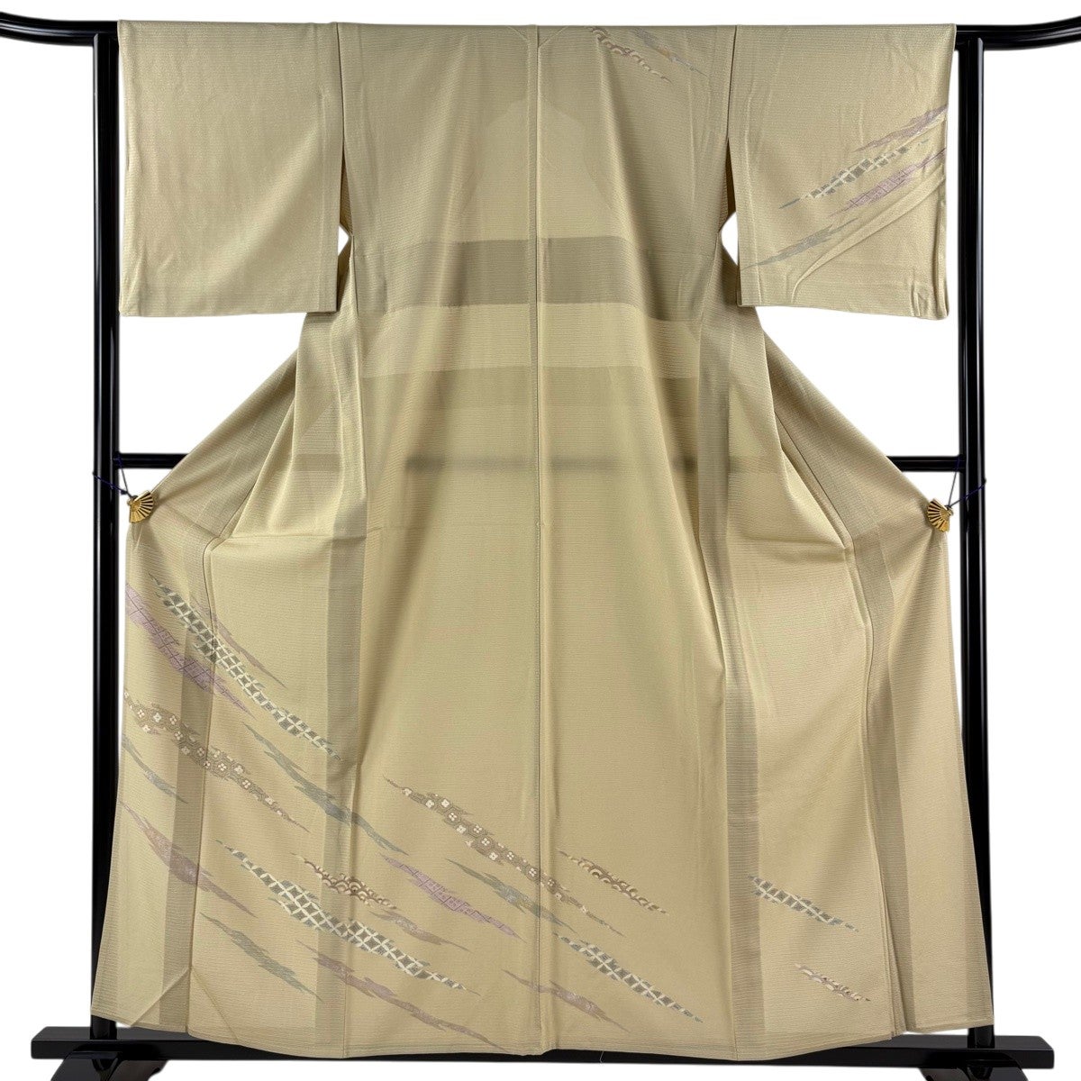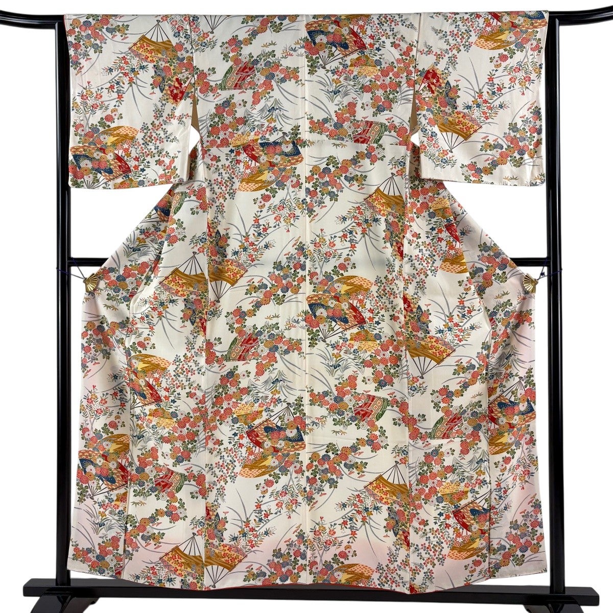 小紋 身丈155cm 裄丈64cm M 袷 扇 草花 クリーム 正絹 優品