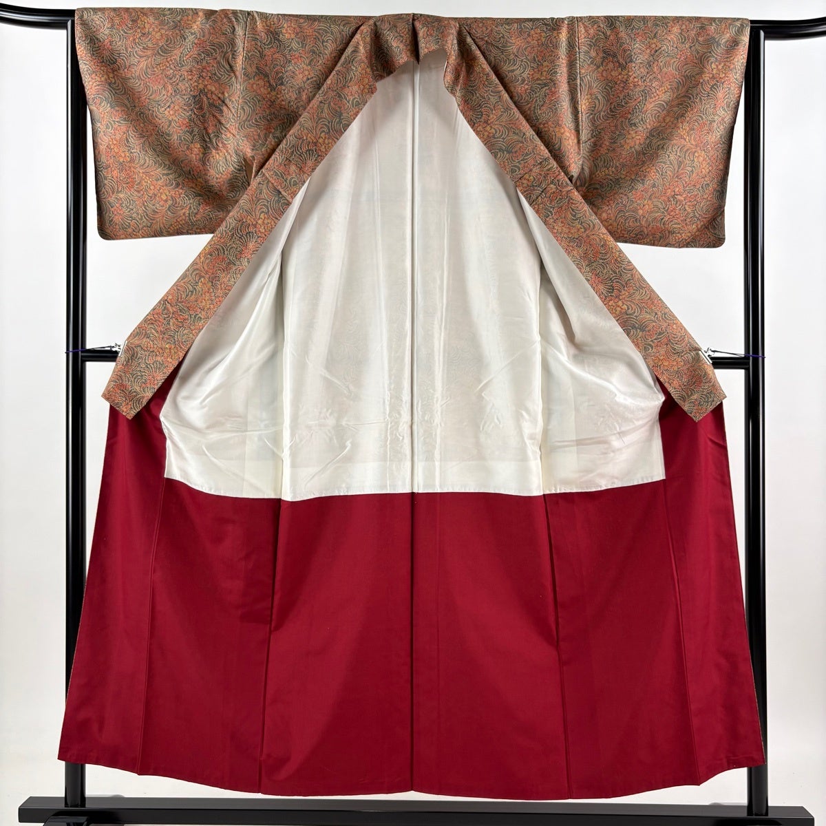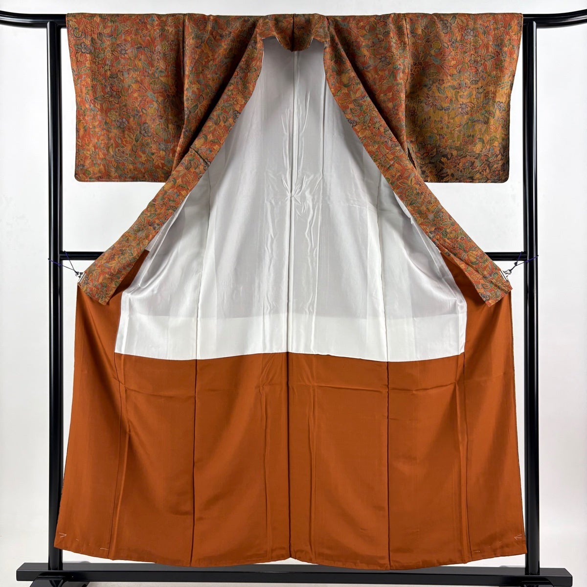 【美品】 小紋 身丈153cm 裄丈64.5cm M 袷 紬地 草花 有職文様 赤茶 正絹 優品