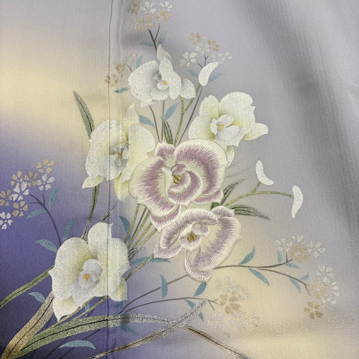 訪問着 身丈152cm 裄丈64cm M 薄物 絽 短冊 草花 染め分け 銀彩 薄黄 正絹 優品