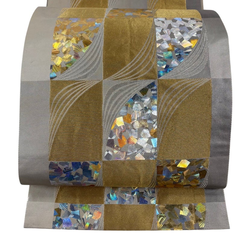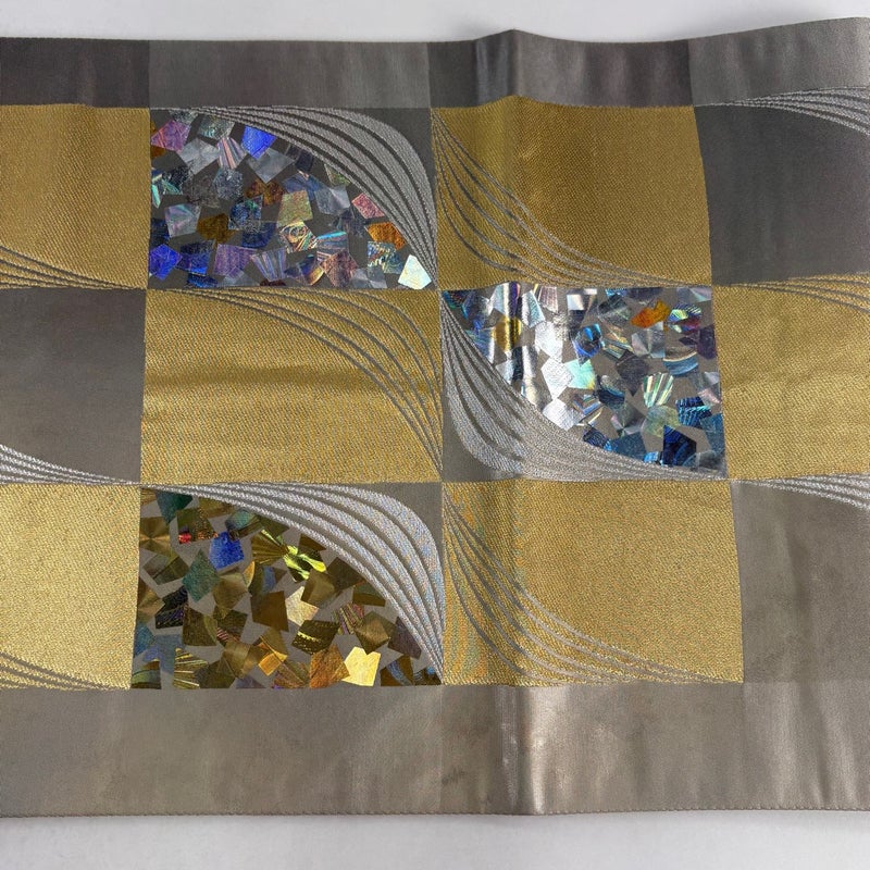 角度によって巧みに表情を変え反射する箔加工を得意とする堀省平の作品でございます。 おめでたい席に相応しい意匠の袋帯でございます。 格式高いお席にもお使いいただけますので、お見逃しのないようお願いいたします。 垂先から手先まで全体に締め跡がございます。 お太鼓にシワがございます。 リユース品としては良い状態で、まだまだご活用頂けると思われます。 ※なお、厳しく商品の状態確認を行っておりますが、記載の汚れ以外にも見落とし箇所がある可能性がある旨ご了承いただけますと幸いです。 沢山の商品の中からご覧いただき誠にありがとうございます。