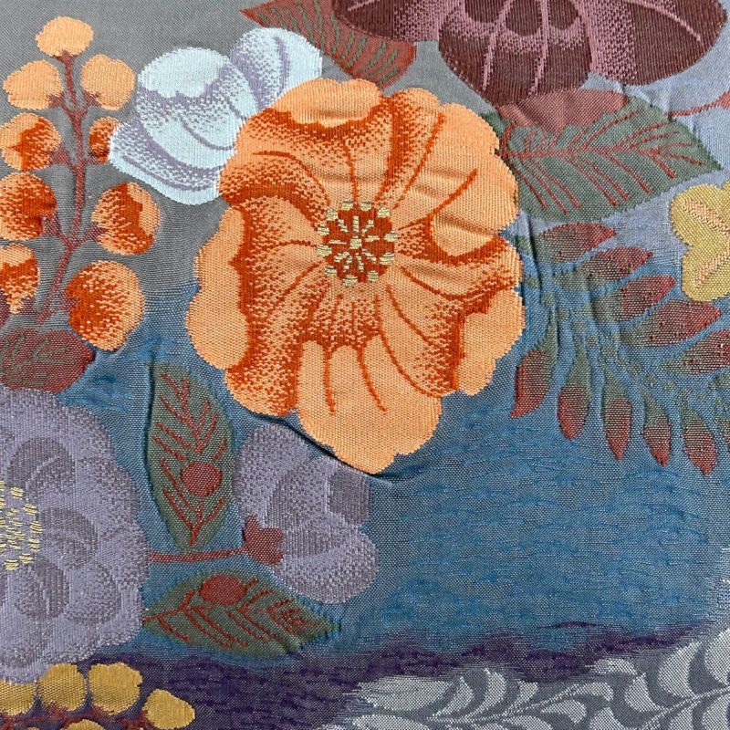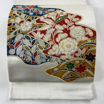 セミフォーマルでお使いいただける袋帯でございます。 見る人に重たい印象を感じさせない女性ならではの、気品豊かな一品です。 垂先と手先と前柄お太鼓間にヤケがございます。 裏地所々に変色がございます。 リユース品としては良い状態で、まだまだご活用頂けると思われます。 沢山の商品の中からご覧いただき誠にありがとうございます。
