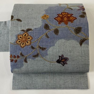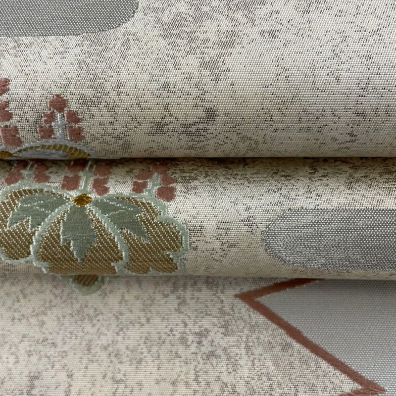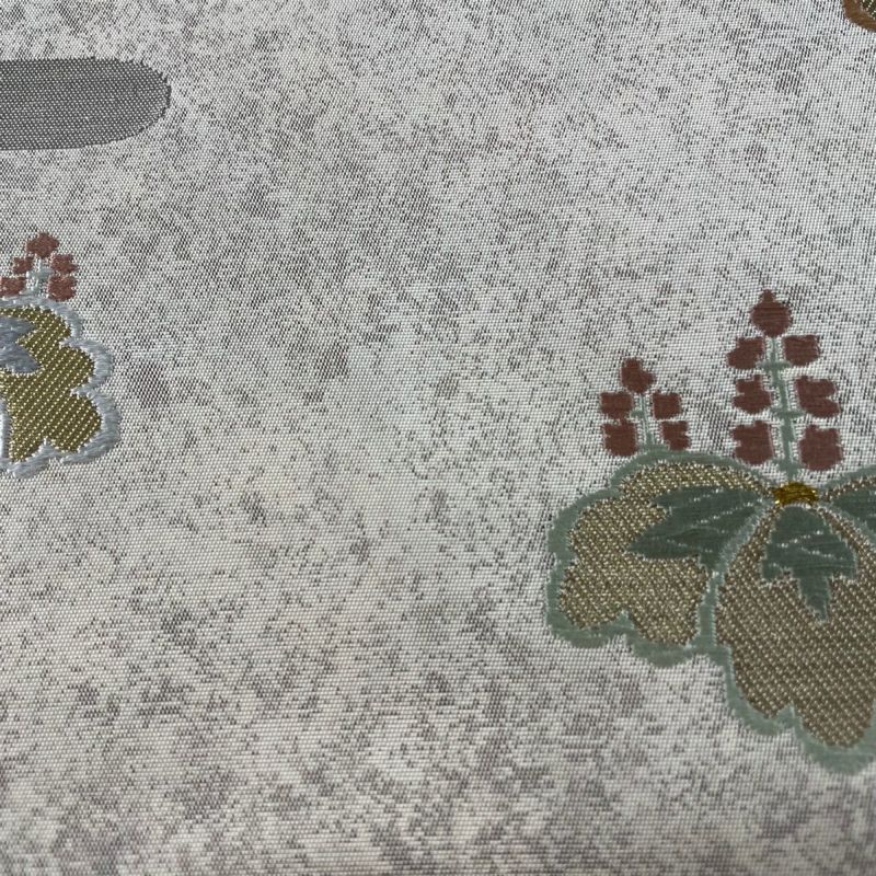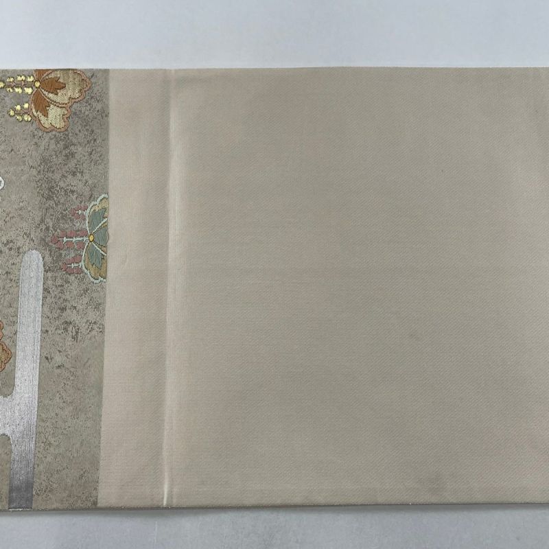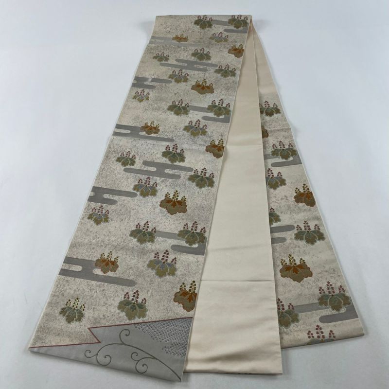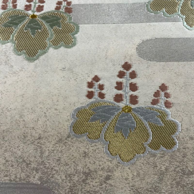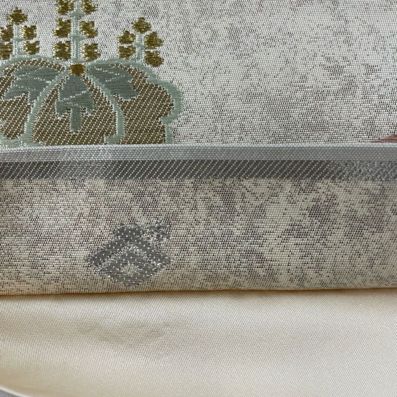 セミフォーマルでお使いいただける袋帯でございます。 見る人に重たい印象を感じさせない女性ならではの、気品豊かな一品です。 中無地にシミ、表地所々に箔の変色がございます。 裏地にシミがございます。 ご購入の際はその点ご留意ください。 沢山の商品の中からご覧いただき誠にありがとうございます。