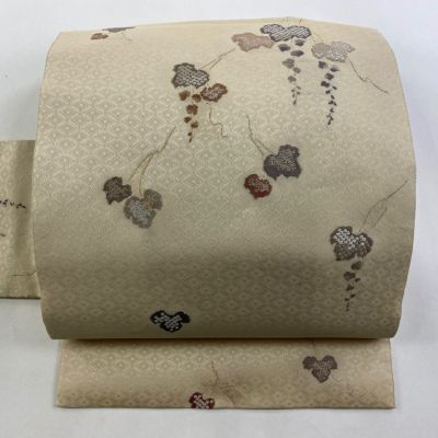 セミフォーマルでお使いいただける袋帯でございます。 見る人に重たい印象を感じさせない女性ならではの、気品豊かな一品です。 締め跡がございます。 リユース品としては目立った染み傷なく、大変状態の良いお品でございます。 沢山の商品の中からご覧いただき誠にありがとうございます。