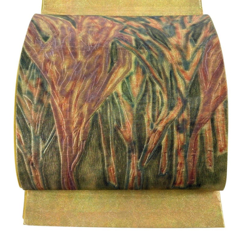 セミフォーマルでお使いいただける袋帯でございます。 見る人に重たい印象を感じさせない女性ならではの、気品豊かな一品です。 帯芯が入っておりません。 締め跡がございます。 締め跡沿いに薄汚れとシワ、前柄お太鼓間にシワと箔の傷みがございます。 リユース品としては良い状態で、まだまだご活用頂けると思われます。 ※なお、厳しく商品の状態確認を行っておりますが、記載の汚れ以外にも見落とし箇所がある可能性がある旨ご了承いただけますと幸いです。 沢山の商品の中からご覧いただき誠にありがとうございます。