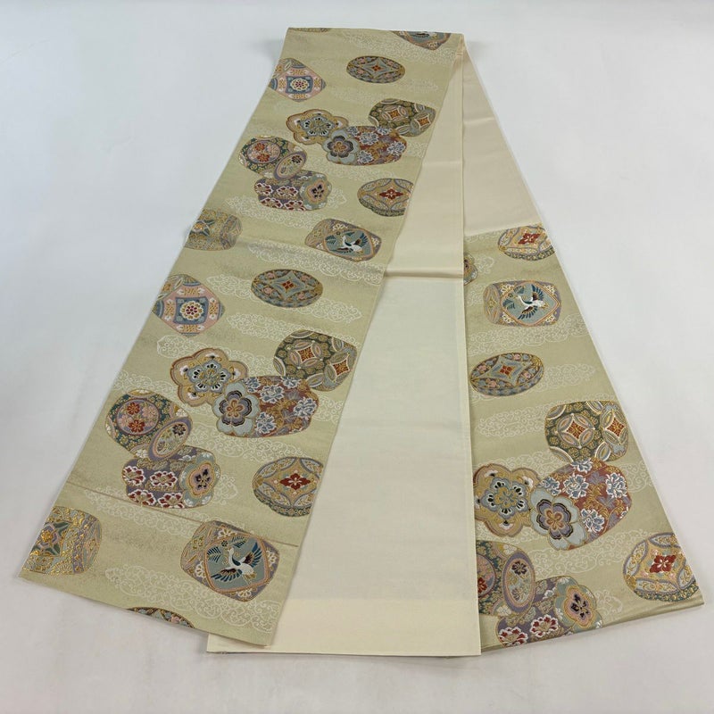 おめでたい席に相応しい意匠の袋帯でございます。 格式高いお席にもお使いいただけますので、お見逃しのないようお願いいたします。 帯芯が入っておりません。 中無地所々に小さなシミや薄いシミがございます。 リユース品としては目立った染み傷なく、状態の良いお品でございます。 ※なお、厳しく商品の状態確認を行っておりますが、記載の汚れ以外にも見落とし箇所がある可能性がある旨ご了承いただけますと幸いです。 沢山の商品の中からご覧いただき誠にありがとうございます。