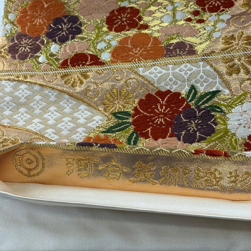 唐織の技術に長けた西陣の老舗、「河合美術織物」の作品です。 おめでたい席に相応しい意匠の袋帯でございます。 格式高いお席にもお使いいただけますので、お見逃しのないようお願いいたします。 締め跡がございます。 中無地所々に小さなシミ、中無地締め跡沿いに汚れがございます。 裏地所々にシワがございます。 リユース品としては目立った染み傷なく、状態の良いお品でございます。 ※なお、厳しく商品の状態確認を行っておりますが、記載の汚れ以外にも見落とし箇所がある可能性がある旨ご了承いただけますと幸いです。 沢山の商品の中からご覧いただき誠にありがとうございます。