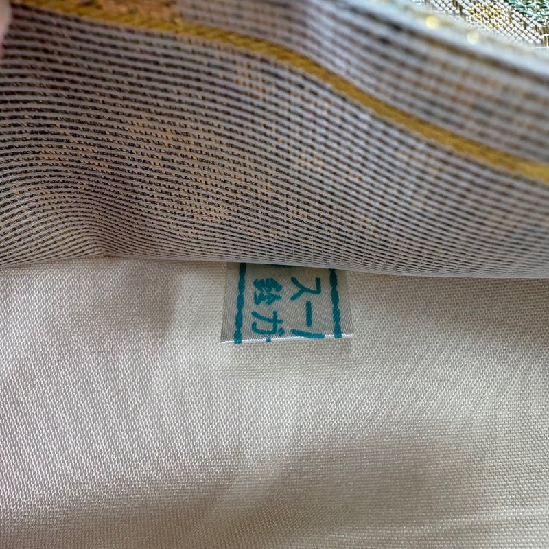 おめでたい席に相応しい意匠の袋帯でございます。 格式高いお席にもお使いいただけますので、お見逃しのないようお願いいたします。 中無地と柄止まりとお太鼓垂先間に生地のヨレ、前柄お太鼓間にシミがございます。 リユース品としては目立った染み傷なく、状態の良いお品でございます。 ※なお、厳しく商品の状態確認を行っておりますが、記載の汚れ以外にも見落とし箇所がある可能性がある旨ご了承いただけますと幸いです。 沢山の商品の中からご覧いただき誠にありがとうございます。