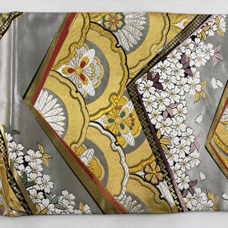【美品】 袋帯 秀品 桜 雪輪青海波 金銀糸 箔 銀色 六通 正絹