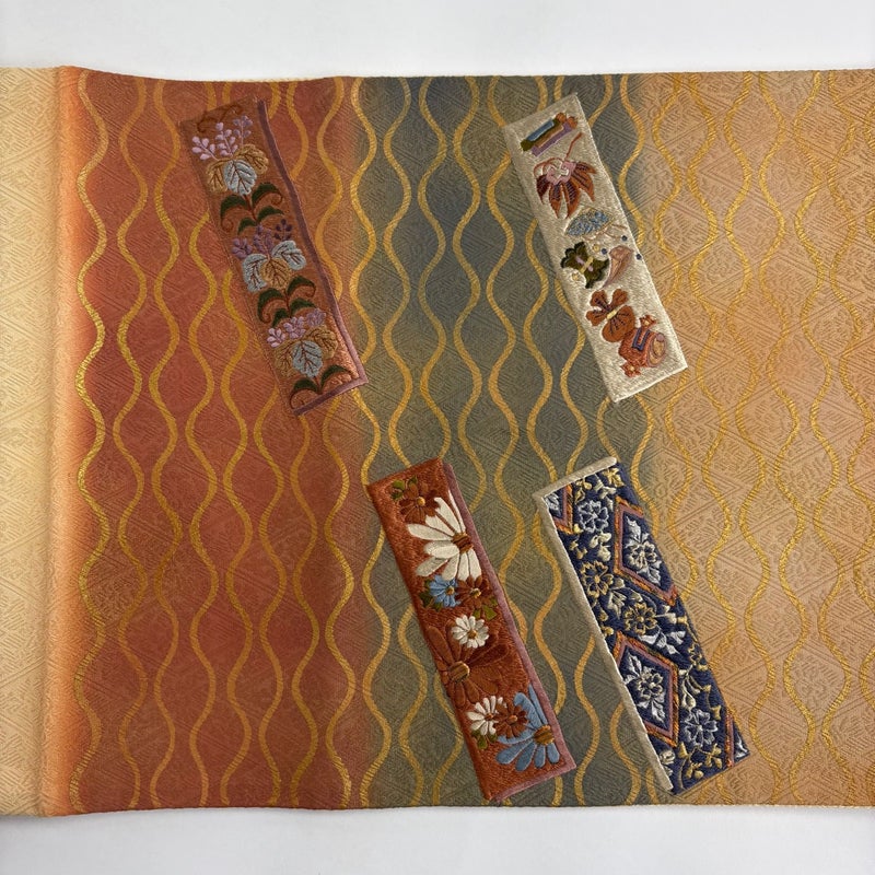 セミフォーマルでお使いいただける袋帯でございます。 見る人に重たい印象を感じさせない女性ならではの、気品豊かな一品です。 帯芯が入っておりません。 締め跡がございます。 手先と手先前柄間の所々にシミ、締め跡沿いと垂先に薄汚れがございます。 リユース品としては良い状態で、まだまだご活用頂けると思われます。 ※なお、厳しく商品の状態確認を行っておりますが、記載の汚れ以外にも見落とし箇所がある可能性がある旨ご了承いただけますと幸いです。 沢山の商品の中からご覧いただき誠にありがとうございます。 OZ