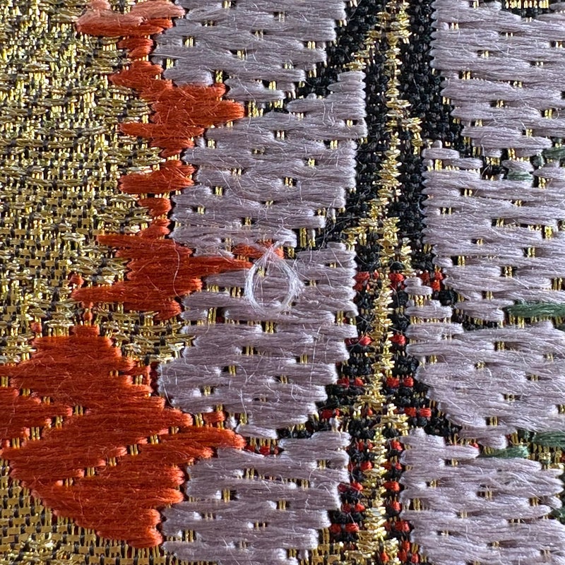 セミフォーマルでお使いいただける袋帯でございます。 見る人に重たい印象を感じさせない女性ならではの、気品豊かな一品です。 表地所々に唐織のゆるみがございます。 裏地全体に締め跡がございます。 締め跡沿いにシワがございます。 リユース品としては良い状態で、まだまだご活用頂けると思われます。 ※なお、厳しく商品の状態確認を行っておりますが、記載の汚れ以外にも見落とし箇所がある可能性がある旨ご了承いただけますと幸いです。 沢山の商品の中からご覧いただき誠にありがとうございます。
