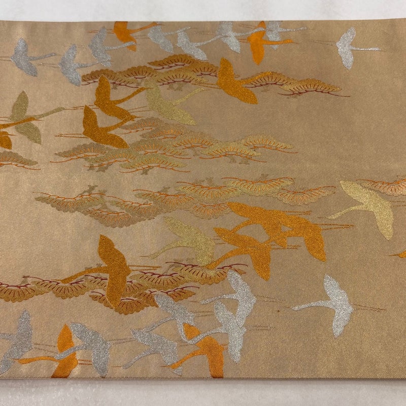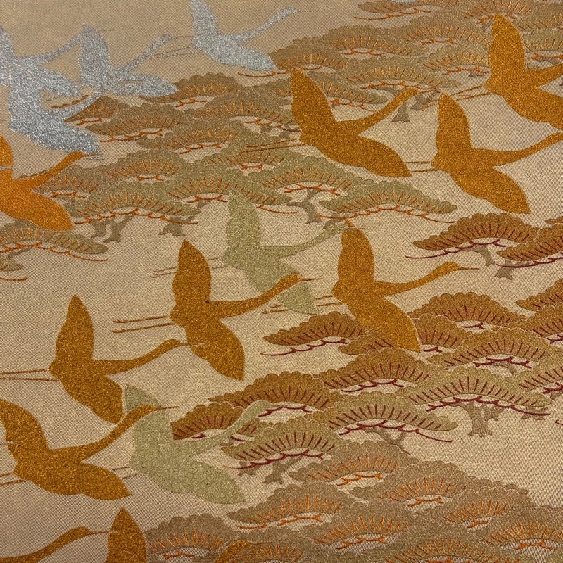 金彩友禅作家、和田光正の手がけた作品になります。 金彩の美しさがよく映える一品です。 おめでたい席に相応しい意匠の袋帯でございます。 格式高いお席にもお使いいただけますので、お見逃しのないようお願いいたします。 締め跡がございます。 手先前柄間など表地所々に小さなシミや薄いシミ、締め跡沿いに薄汚れ、表地所々に若干の金彩の変色がございます。 リユース品としては目立った染み傷なく、状態の良いお品でございます。 ※なお、厳しく商品の状態確認を行っておりますが、記載の汚れ以外にも見落とし箇所がある可能性がある旨ご了承いただけますと幸いです。 沢山の商品の中からご覧いただき誠にありがとうございます。