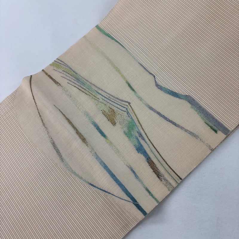 夏帯でございます。 セミフォーマルでお使いいただける袋帯でございます。 見る人に重たい印象を感じさせない女性ならではの、気品豊かな一品です。 締め跡がございます。 お太鼓柄部分と前柄柄部分に金糸の変色がございます。 リユース品としては良い状態で、まだまだご活用頂けると思われます。 ※なお、厳しく商品の状態確認を行っておりますが、記載の汚れ以外にも見落とし箇所がある可能性がある旨ご了承いただけますと幸いです。 沢山の商品の中からご覧いただき誠にありがとうございます。