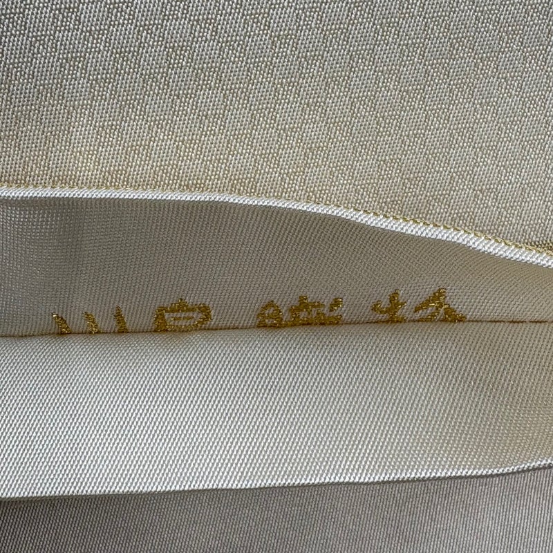 軍配マークと三本線が特徴の「川島織物」謹製の作品です。 セミフォーマルでお使いいただける袋帯でございます。 見る人に重たい印象を感じさせない女性ならではの、気品豊かな一品です。 締め跡がございます。 中無地締め跡沿いに薄汚れ、表地所々とお太鼓と中無地所々にシワ、表地所々とお太鼓所々に箔の変色がございます。 裏地所々にシワがございます。 リユース品としては良い状態で、まだまだご活用頂けると思われます。 ※なお、厳しく商品の状態確認を行っておりますが、記載の汚れ以外にも見落とし箇所がある可能性がある旨ご了承いただけますと幸いです。 沢山の商品の中からご覧いただき誠にありがとうございます。