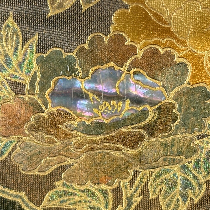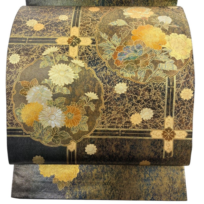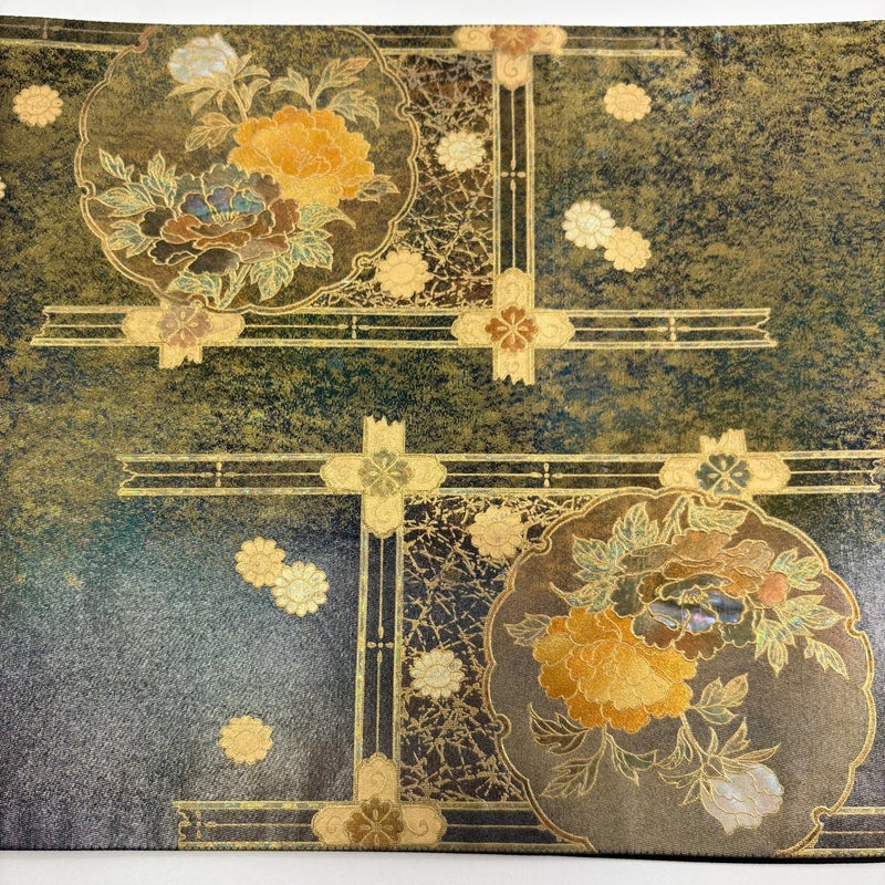 セミフォーマルでお使いいただける袋帯でございます。 見る人に重たい印象を感じさせない女性ならではの、気品豊かな一品です。 締め跡がございます。 お太鼓柄部分と前柄柄部分に螺鈿のくすみや傷がございます。 手先前柄間に箔の傷みがございます。 リユース品としては良い状態で、まだまだご活用頂けると思われます。 ※なお、厳しく商品の状態確認を行っておりますが、記載の汚れ以外にも見落とし箇所がある可能性がある旨ご了承いただけますと幸いです。 沢山の商品の中からご覧いただき誠にありがとうございます。