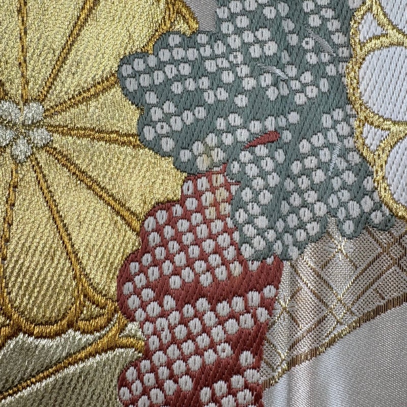 セミフォーマルでお使いいただける袋帯でございます。 見る人に重たい印象を感じさせない女性ならではの、気品豊かな一品です。 締め跡がございます。 前柄とお太鼓垂先間にシミ、お太鼓付近と前柄付近にシワがございます。 裏地にシミがございます。 リユース品としては良い状態で、まだまだご活用頂けると思われます。 ※なお、厳しく商品の状態確認を行っておりますが、記載の汚れ以外にも見落とし箇所がある可能性がある旨ご了承いただけますと幸いです。 沢山の商品の中からご覧いただき誠にありがとうございます。