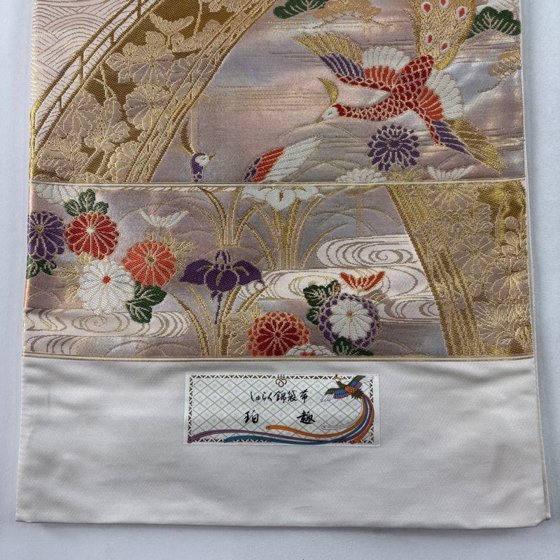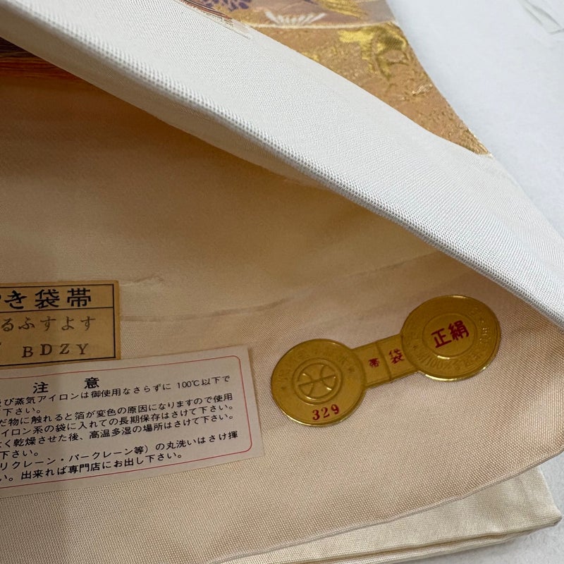 京都西陣、染と織の名門「じゅらく」謹製による作品でございます。 セミフォーマルでお使いいただける袋帯でございます。 見る人に重たい印象を感じさせない女性ならではの、気品豊かな一品です。 帯芯が入っておりません。 締め跡がございます。 リユース品としては目立った染み傷なく、状態の良いお品でございます。 ※なお、厳しく商品の状態確認を行っておりますが、記載の汚れ以外にも見落とし箇所がある可能性がある旨ご了承いただけますと幸いです。 沢山の商品の中からご覧いただき誠にありがとうございます。