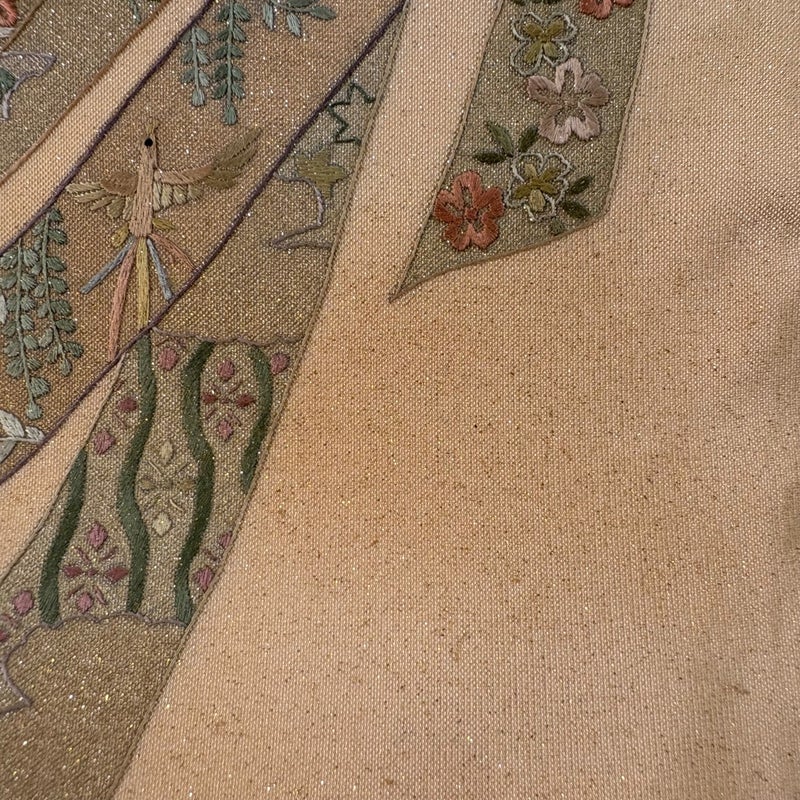 セミフォーマルでお使いいただける袋帯でございます。 見る人に重たい印象を感じさせない女性ならではの、気品豊かな一品です。 締め跡がございます。 表地所々に線シミ、表地所々に金糸の変色がございます。 リユース品としては良い状態で、まだまだご活用頂けると思われます。 ※なお、厳しく商品の状態確認を行っておりますが、記載の汚れ以外にも見落とし箇所がある可能性がある旨ご了承いただけますと幸いです。 沢山の商品の中からご覧いただき誠にありがとうございます。