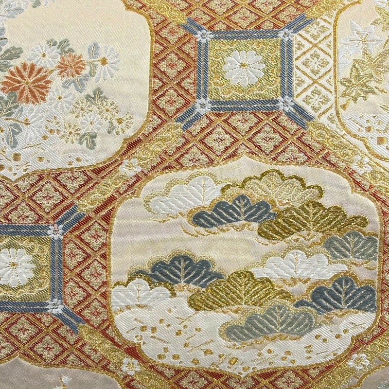 「河村つづれ」で知られる西陣名門『河村織物』の帯でございます。 おめでたい席に相応しい意匠の袋帯でございます。 格式高いお席にもお使いいただけますので、お見逃しのないようお願いいたします。 締め跡がございます。 リユース品としては目立った染み傷なく、状態の良いお品でございます。 ※なお、厳しく商品の状態確認を行っておりますが、記載の汚れ以外にも見落とし箇所がある可能性がある旨ご了承いただけますと幸いです。 沢山の商品の中からご覧いただき誠にありがとうございます。