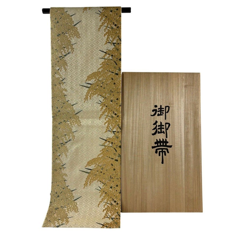 映画・テレビドラマ・舞台・雑誌などに於いて、数多くの衣裳監修を手掛けている「山口美術織物」の作品です。 おめでたい席に相応しい意匠の袋帯でございます。 格式高いお席にもお使いいただけますので、お見逃しのないようお願いいたします。 リユース品としては目立った染み傷なく、状態の良いお品でございます。 ※なお、厳しく商品の状態確認を行っておりますが、記載の汚れ以外にも見落とし箇所がある可能性がある旨ご了承いただけますと幸いです。 沢山の商品の中からご覧いただき誠にありがとうございます。