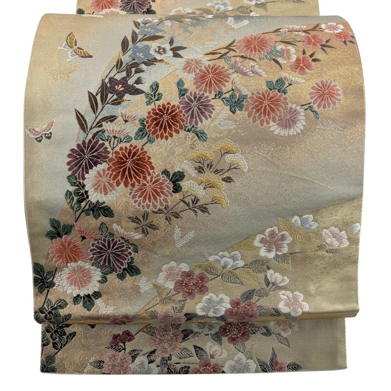 セミフォーマルでお使いいただける袋帯でございます。 見る人に重たい印象を感じさせない女性ならではの、気品豊かな一品です。 締め跡がございます。 リユース品としては目立った染み傷なく、状態の良いお品でございます。 ※なお、厳しく商品の状態確認を行っておりますが、記載の汚れ以外にも見落とし箇所がある可能性がある旨ご了承いただけますと幸いです。 沢山の商品の中からご覧いただき誠にありがとうございます。