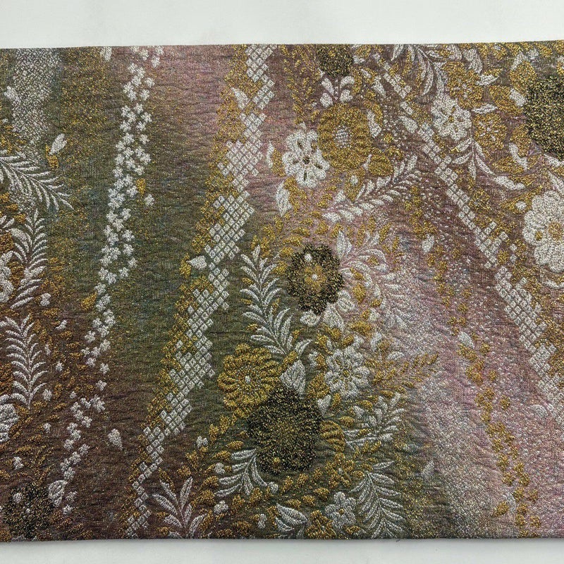 セミフォーマルでお使いいただける袋帯でございます。 見る人に重たい印象を感じさせない女性ならではの、気品豊かな一品です。 お太鼓垂先間にシワがございます。 リユース品としては目立った染み傷なく、状態の良いお品でございます。 ※なお、厳しく商品の状態確認を行っておりますが、記載の汚れ以外にも見落とし箇所がある可能性がある旨ご了承いただけますと幸いです。 沢山の商品の中からご覧いただき誠にありがとうございます。