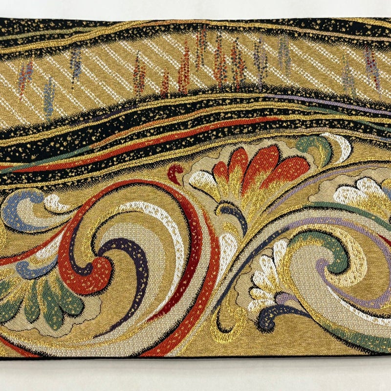 セミフォーマルでお使いいただける袋帯でございます。 見る人に重たい印象を感じさせない女性ならではの、気品豊かな一品です。 締め跡がございます。 リユース品としては目立った染み傷なく、状態の良いお品でございます。 ※なお、厳しく商品の状態確認を行っておりますが、記載の汚れ以外にも見落とし箇所がある可能性がある旨ご了承いただけますと幸いです。 沢山の商品の中からご覧いただき誠にありがとうございます。