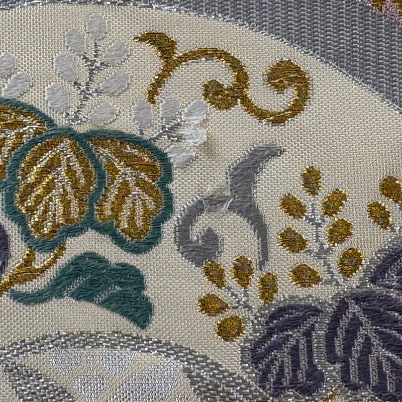 おめでたい席に相応しい意匠の袋帯でございます。 格式高いお席にもお使いいただけますので、お見逃しのないようお願いいたします。 締め跡がございます。 手先とお太鼓垂先間と前柄お太鼓間などに刺繍糸のゆるみがございます。 リユース品としては良い状態で、まだまだご活用頂けると思われます。 ※なお、厳しく商品の状態確認を行っておりますが、記載の汚れ以外にも見落とし箇所がある可能性がある旨ご了承いただけますと幸いです。 沢山の商品の中からご覧いただき誠にありがとうございます。 【PR2】