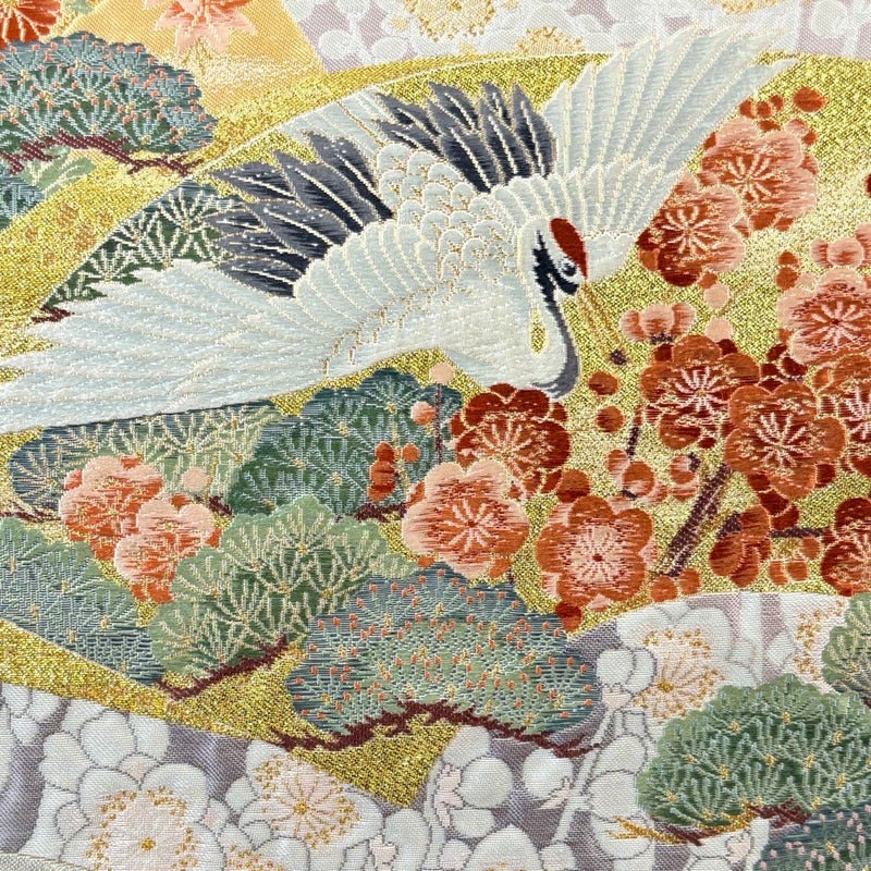 おめでたい席に相応しい意匠の袋帯でございます。 格式高いお席にもお使いいただけますので、お見逃しのないようお願いいたします。 帯芯が入っておりません。 締め跡がございます。 中無地にヤケ、中無地にシミがございます。 裏地所々に生地のヨレがございます。 ※商品の仕立て上、垂先の織り出し口から裏地がはみ出ております。 リユース品としては目立った染み傷なく、状態の良いお品でございます。 ※なお、厳しく商品の状態確認を行っておりますが、記載の汚れ以外にも見落とし箇所がある可能性がある旨ご了承いただけますと幸いです。 沢山の商品の中からご覧いただき誠にありがとうございます。 【PR2】